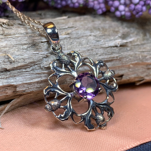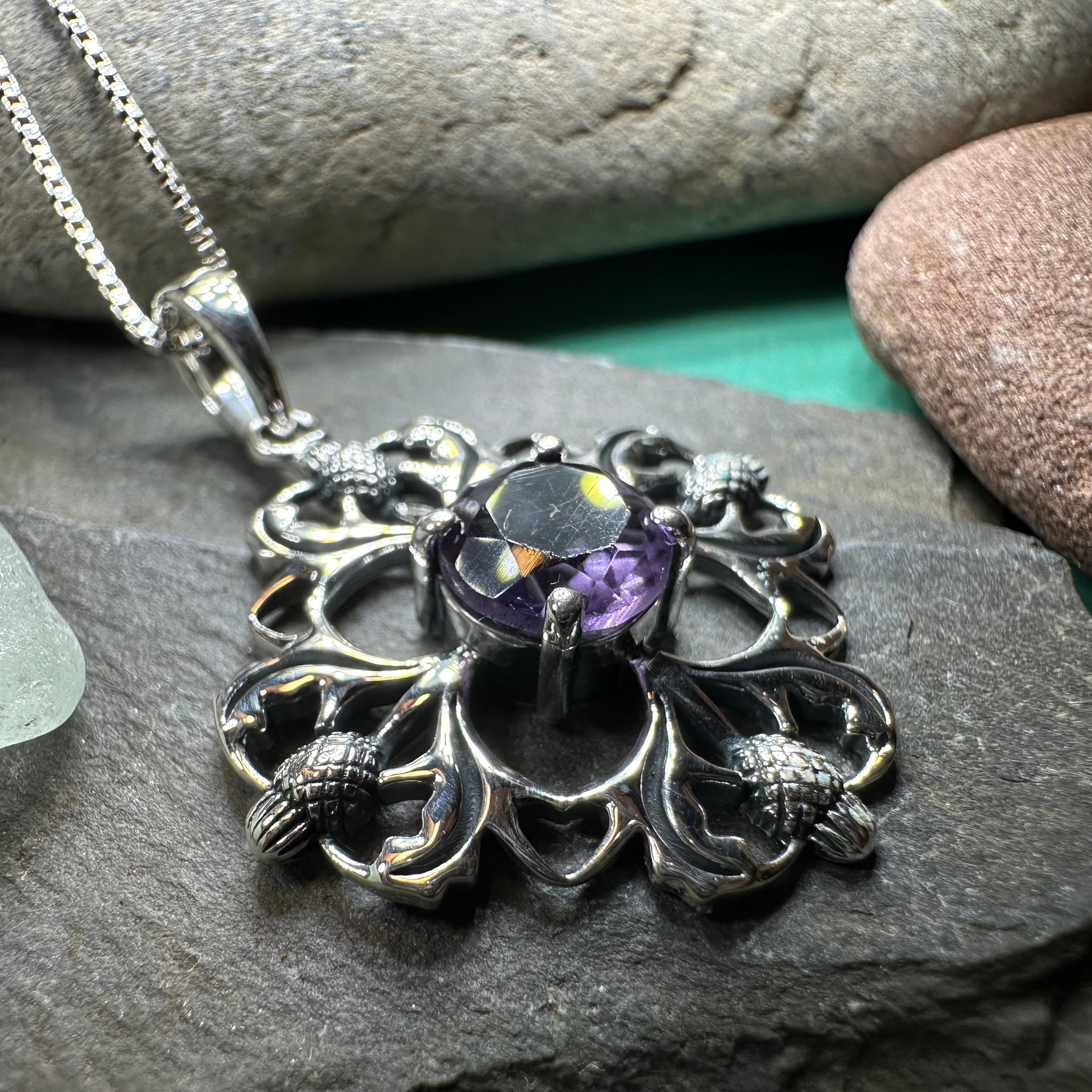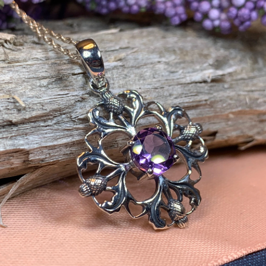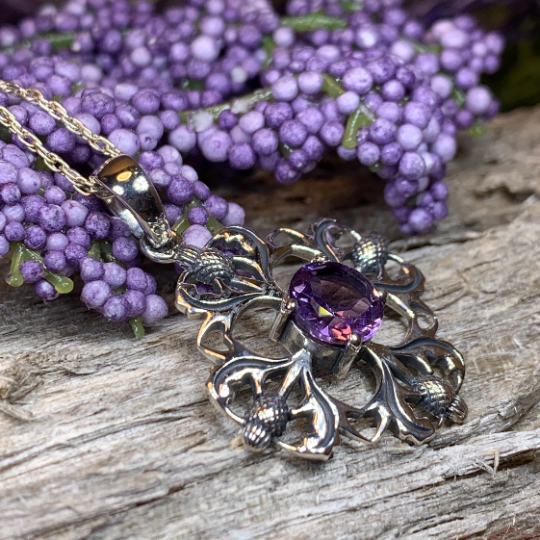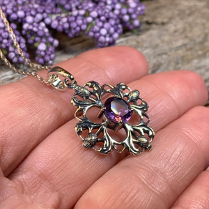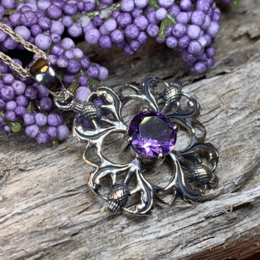 This beautifully detailed necklace features four thistles arranged to create an intricate flower. A center faceted 1 carat amethyst gives this piece a lovely bit of color and elegance.