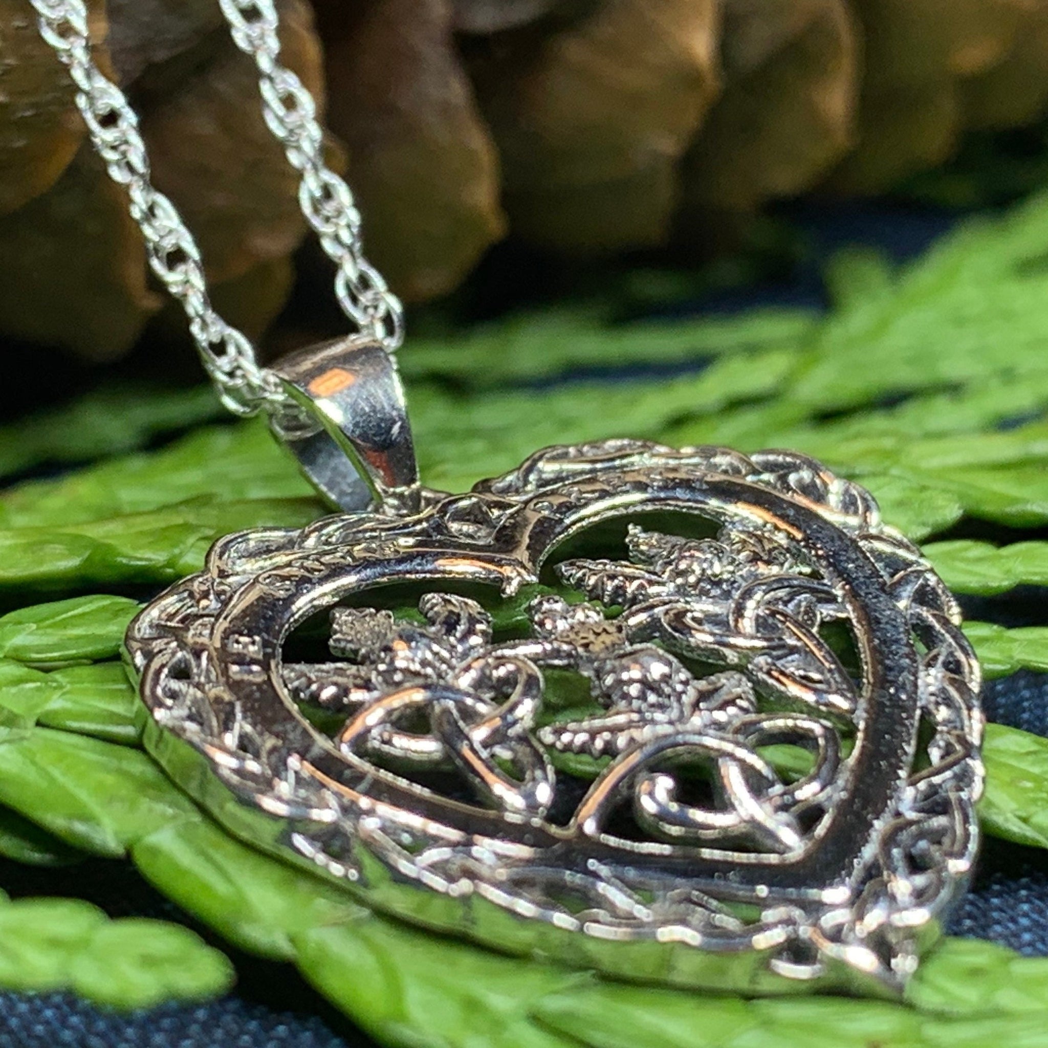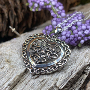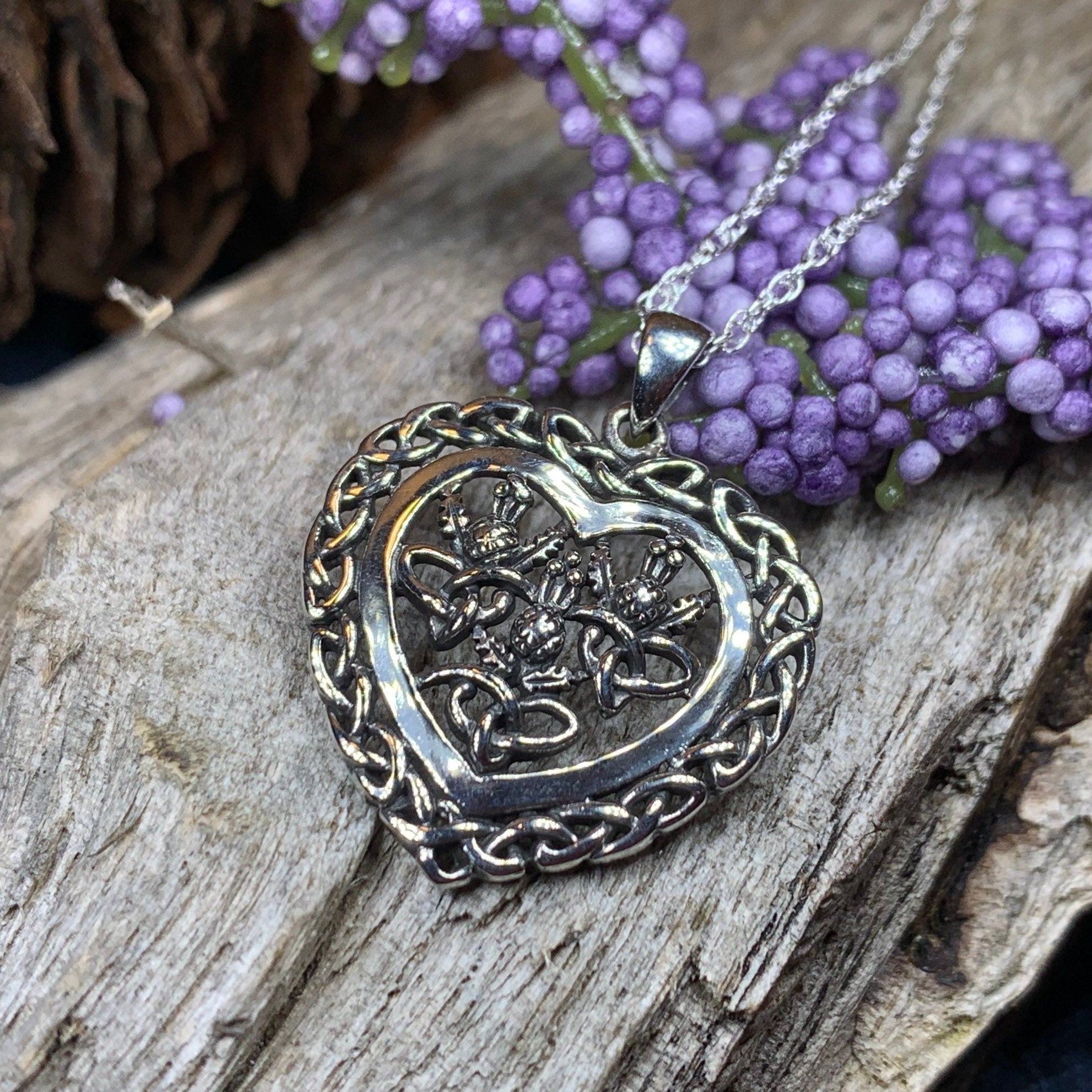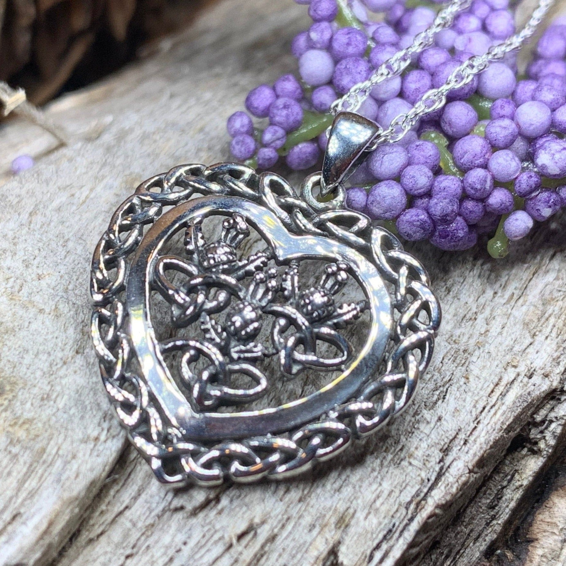 The beautiful design has the leaves of the thistles creating a heart shape symbolize ever-lasting love. This pendant features the same small Jacobean Thistle blooms interspersed with Celtic Knots.