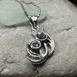 This sweet little sterling silver thistle necklace will look lovely on you! The thistles are detailed and has genuine amethyst center stones.