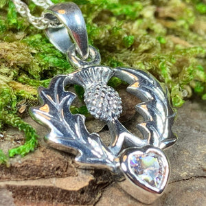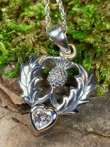 This sweet little sterling silver thistle necklace will look lovely on you! The thistle is detailed with a heart shaped center stone.