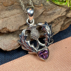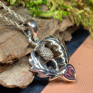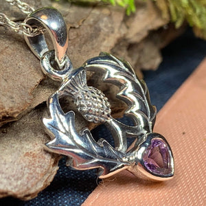 Solid sterling silver Scottish Thistle Pendant with amethyst or cubic zirconia stone on an 18" chain
