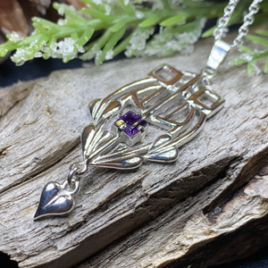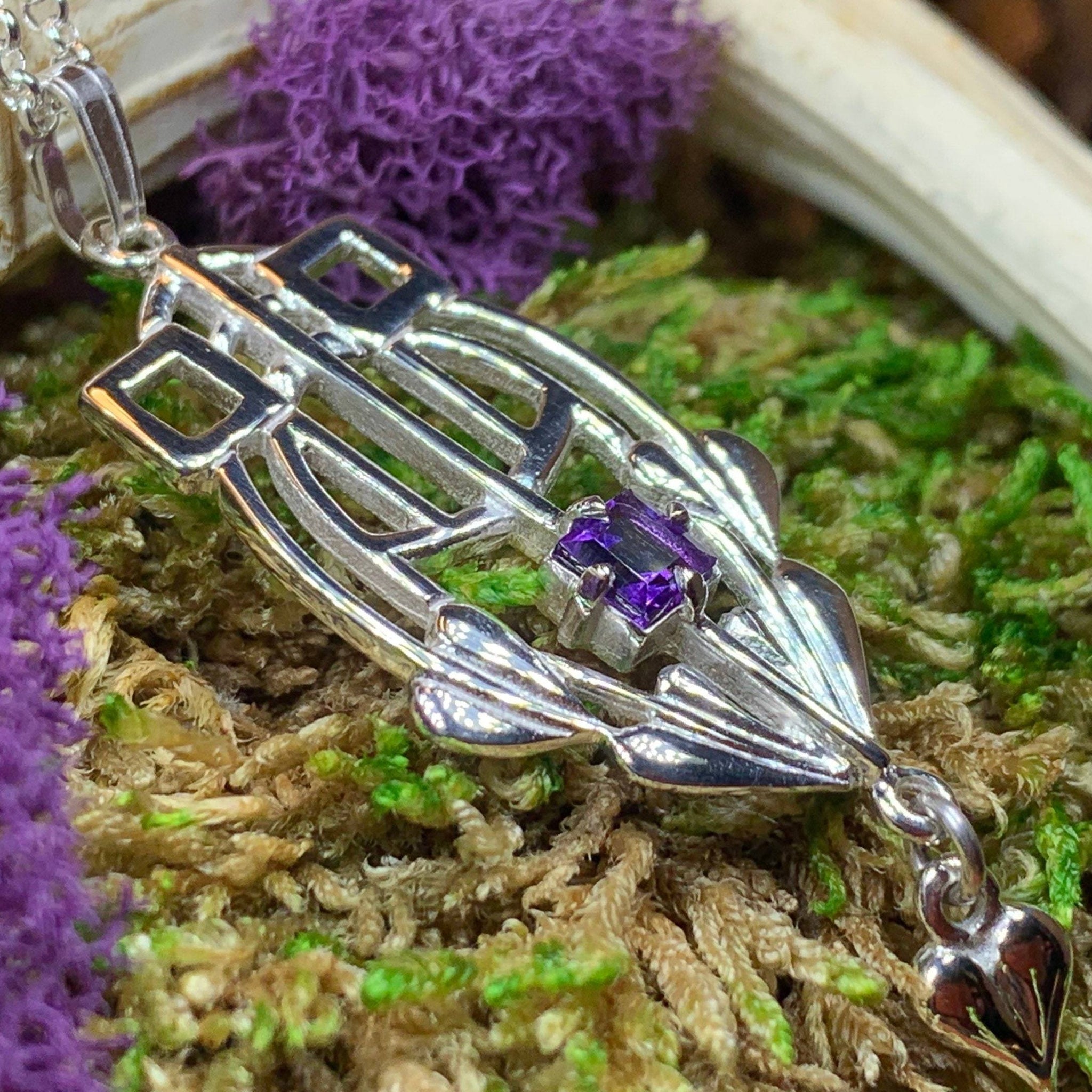 Solid sterling silver Celtic Mackintosh Thistle Necklace with authentic square cut amethyst gemstone (.75 carat).