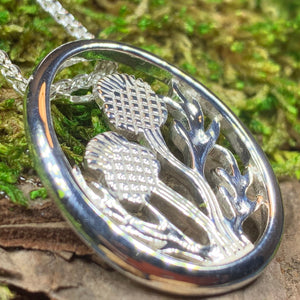 Two beautifully detailed thistles surrounded by the scrolling leaves and stems in a bright oval shape. A heavy sterling silver piece that will be treasured for a lifetime.