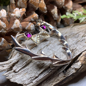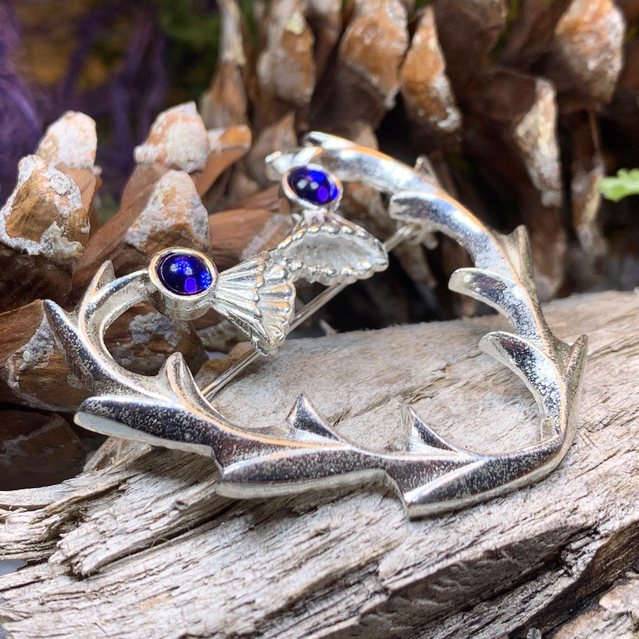 This lovely thistle with a twist of leaves scrolling around into the shape of a heart makes a lovely brooch for a kilt, sweater or coat. The vibrant colored crystals gives the brooch a flash of color and really makes this beautiful piece stand out! Solid pewter with your choice of crystal colors.