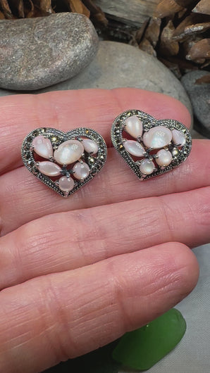 Gorgeous glowing green agates or shimmering pink mother of pearl in a heart shape set in solid sterling silver. The stone shimmers in a rich deep and mysterious hue - beautiful cabochon stones with a soft, rich color that will dazzle you! A touch of marcasite gemstone around the border adds additional sparkle and interest.