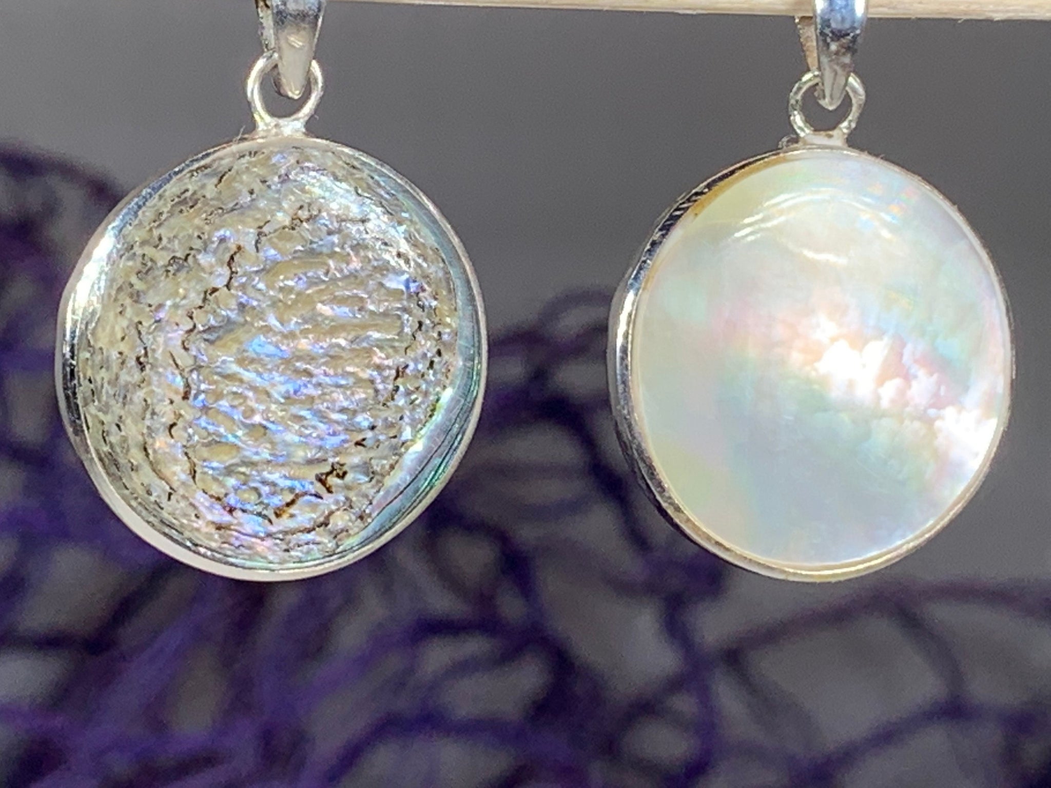 The natural shell inlay can be seen from both sides of this pendant making it beautiful on both sides - like two pendants in one! Your choice of abalone or mother of pearl shell.