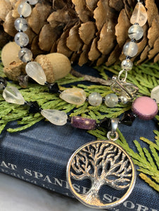 A one of a work of art with pink, black, gray and cream colors. Beautiful pink sunset colors with touches of natural crystal quartz beads and Swarovski crystal.