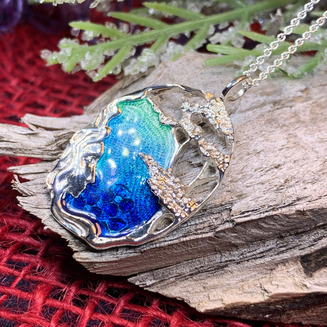 1 1/4" x 1" pendant with enamel accents on an 18" silver chain - all solid sterling silver. Handmade in Scotland.