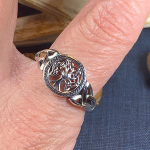 A unique design combining the traditional elements of a tree of life in a round design with open work trinity knots at the sides - beautiful highly polished sterling silver.
