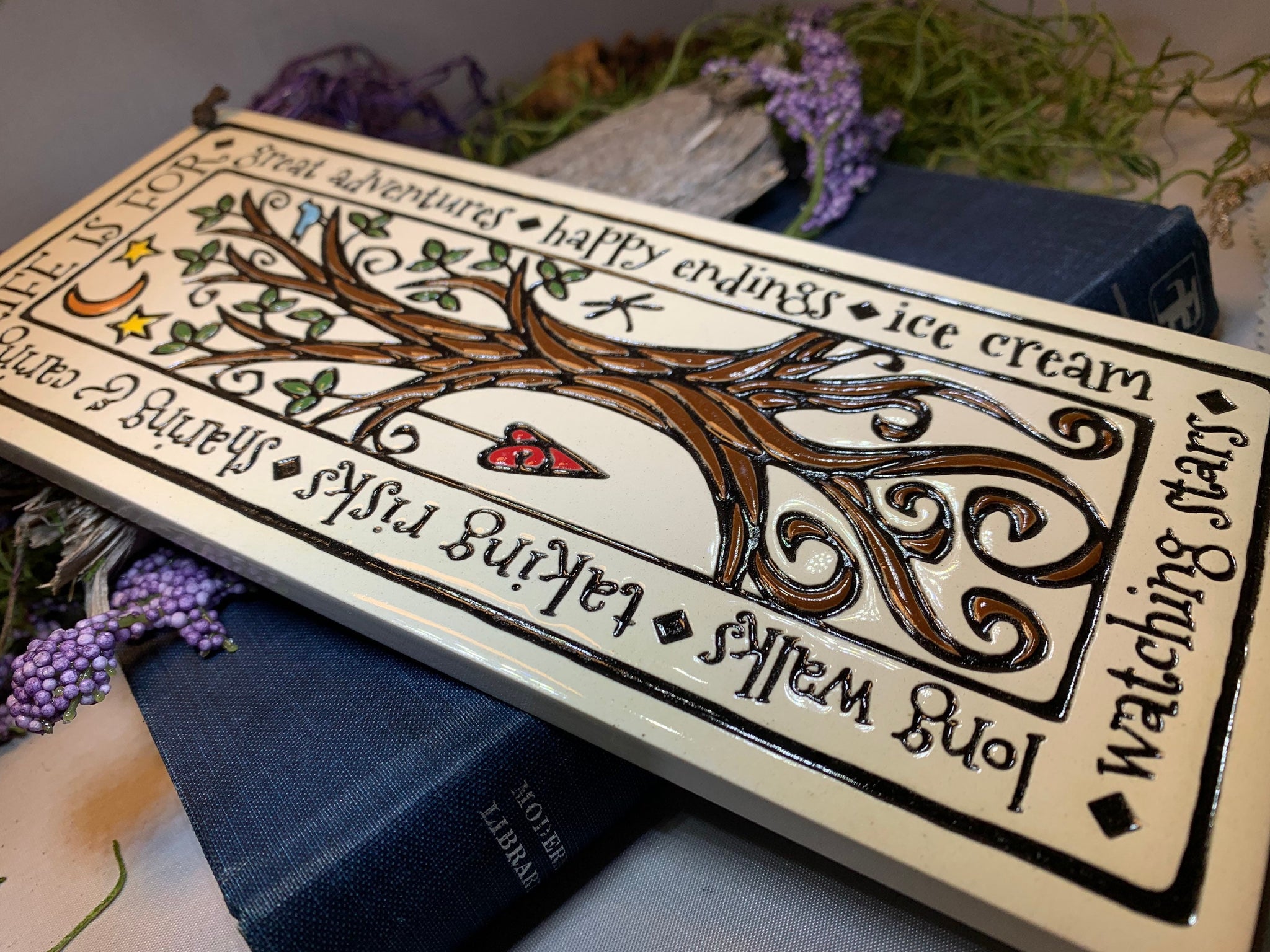 The design of this piece is unique because the lettering is etched into the clay rather than just applied to the surface. This gives the piece a dimensional quality that can be appreciated with the hand and the eye! All colors are hand glazed and each piece is kiln fired twice to nearly 2000 degrees. The result is a fade proof work of art that will last a lifetime indoors or outdoors.