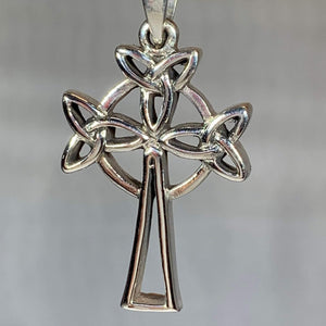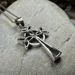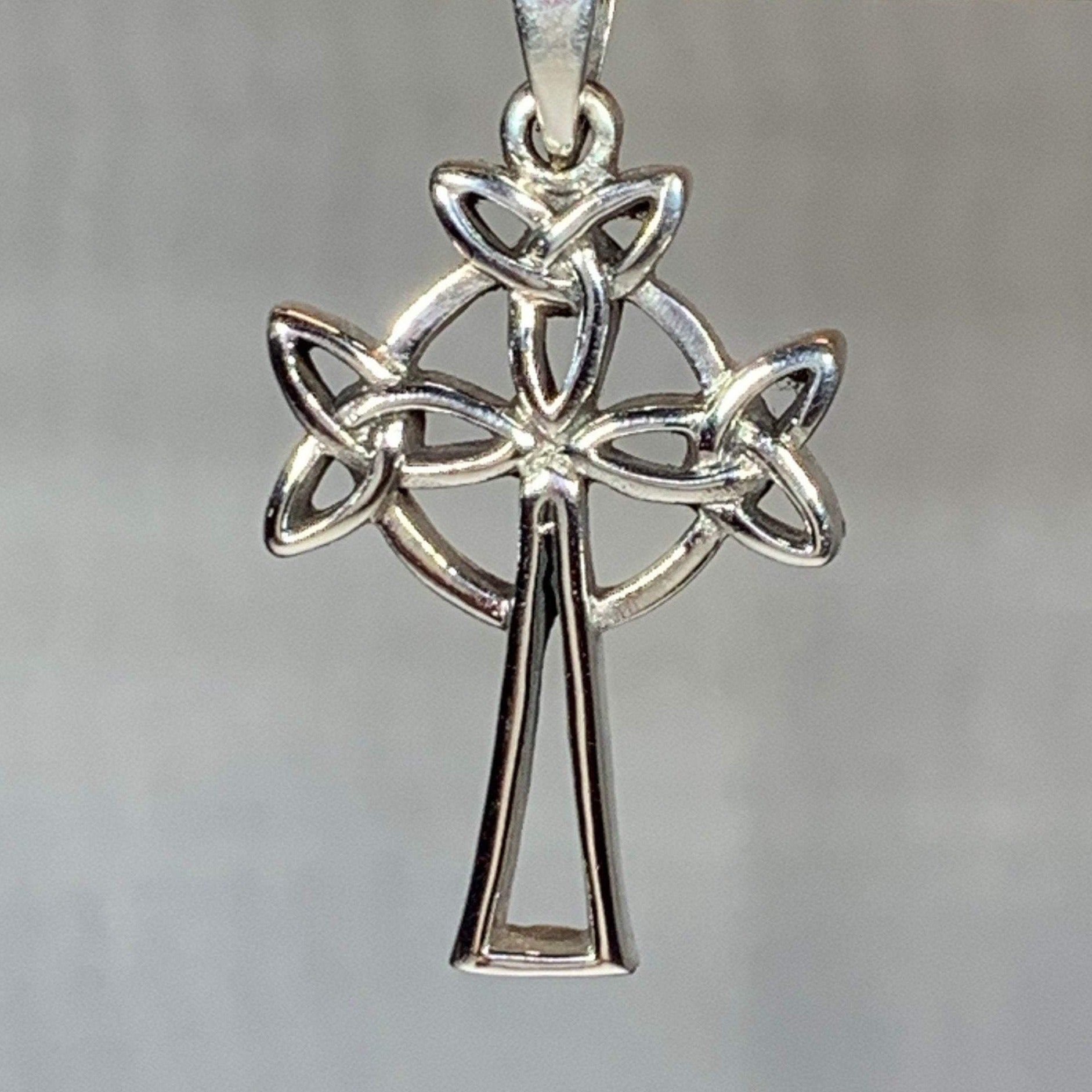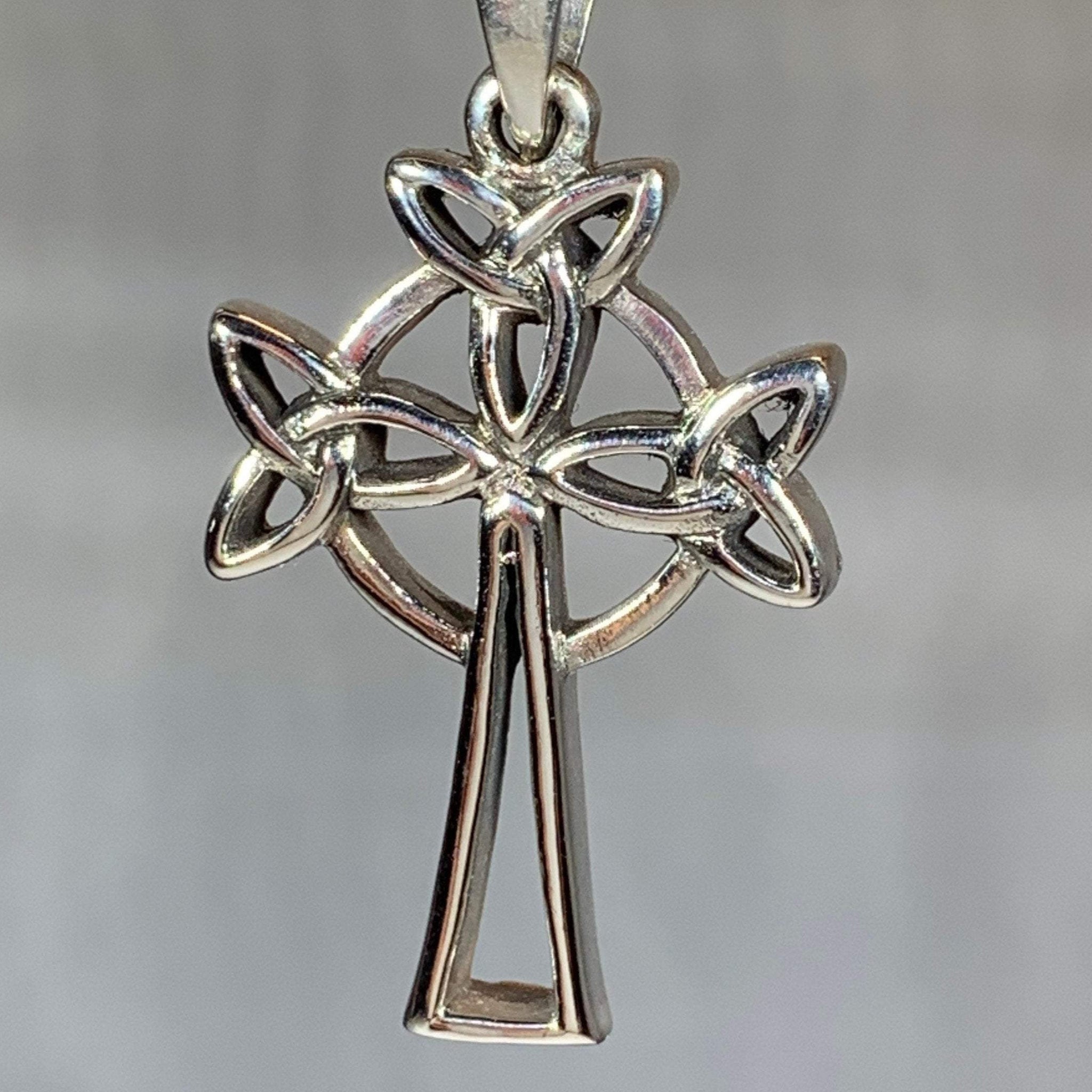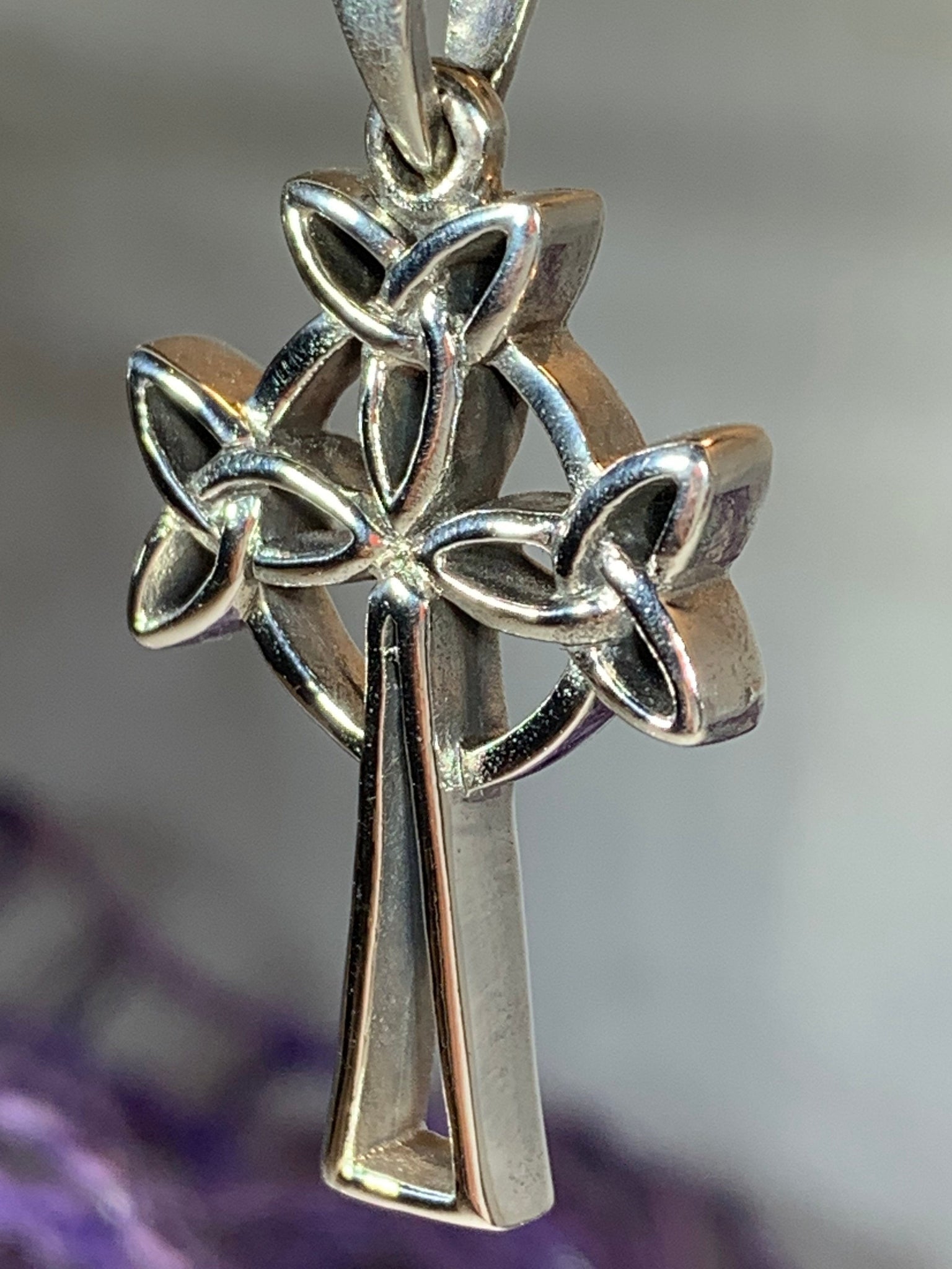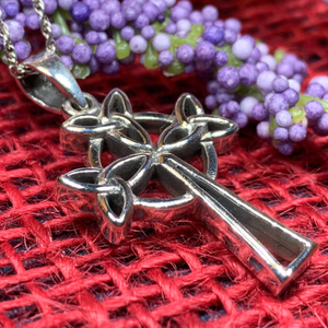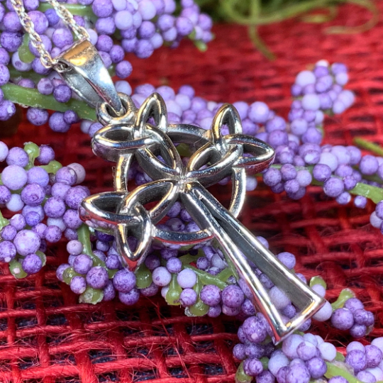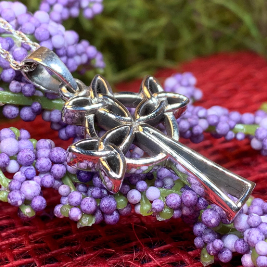 The four trinity knots, a powerful and ancient symbol, are intricately woven into the design, making this cross both visually appealing and spiritually meaningful.