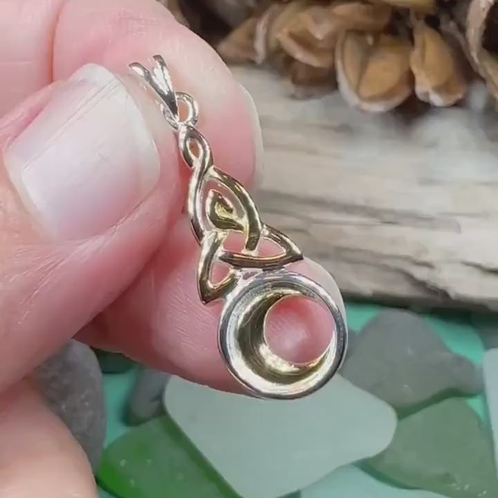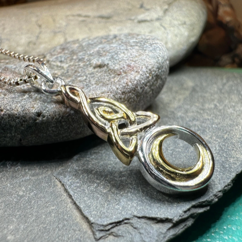 Dainty but commanding, this pendant shows the Triskele (The Trinity) and the Crescent Moon (symbol of growth).