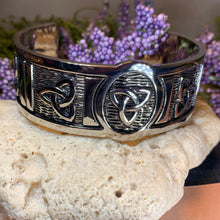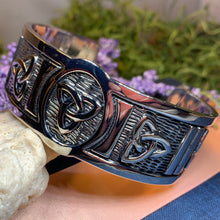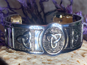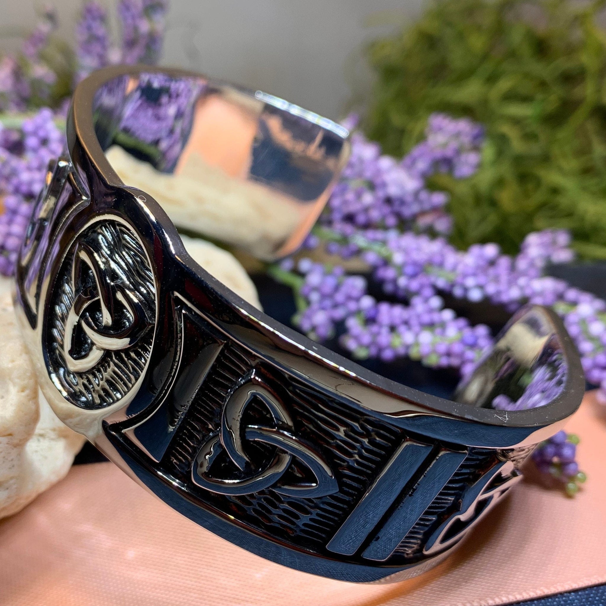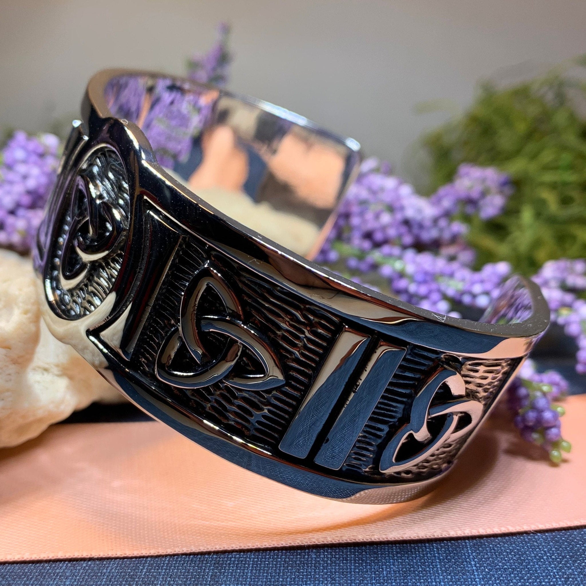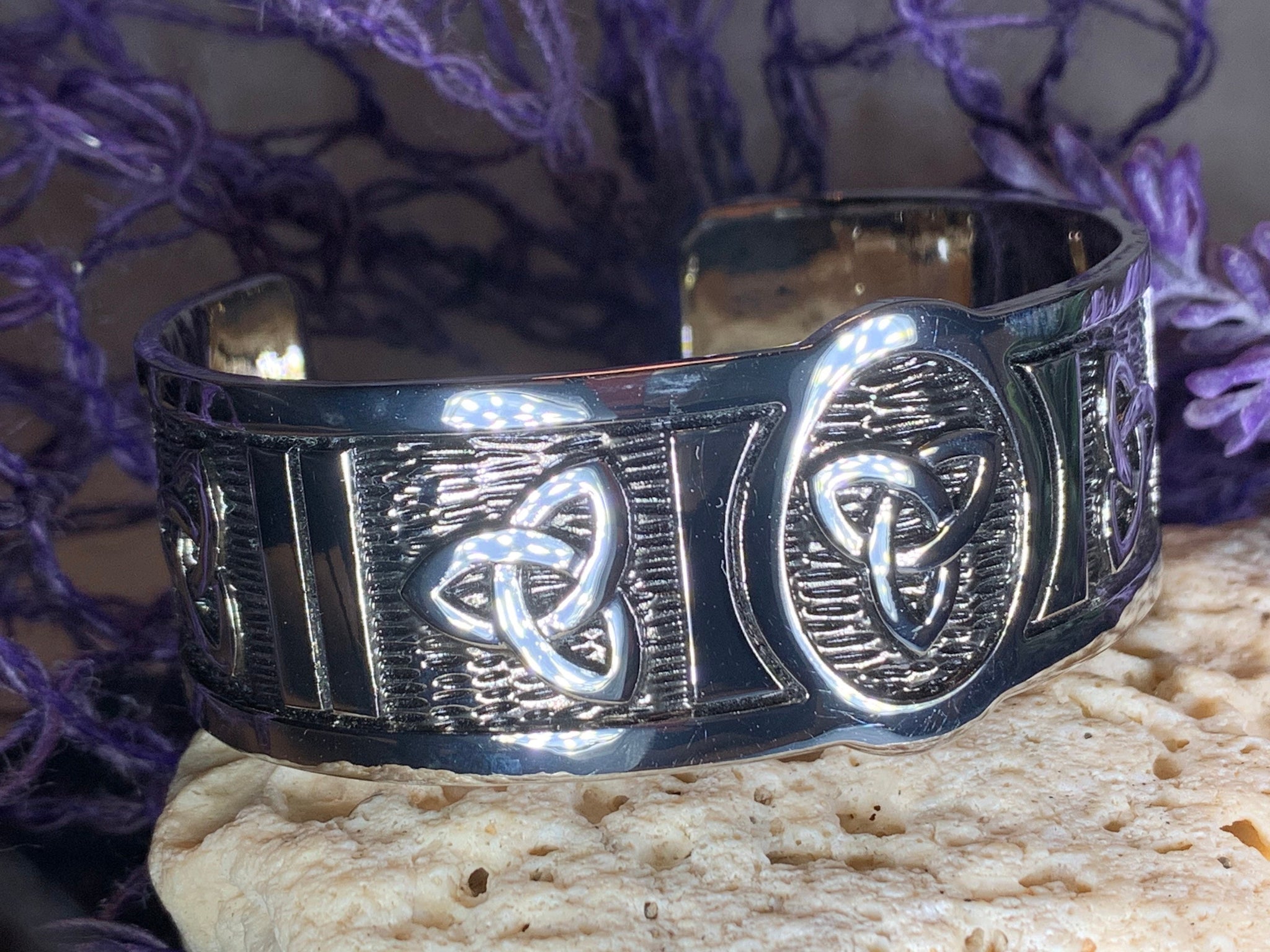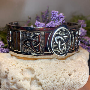 Stunning! Our highly polished Pewter Celtic Knot Bangle Bracelet features an ancient Celtic Trinity Knot design that goes back thousands of years, embraced on both sides by a Celtic knot work pattern.