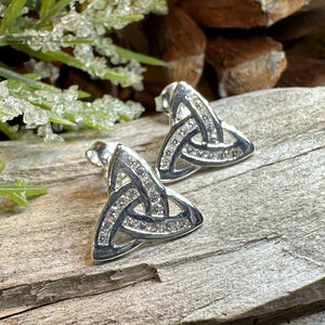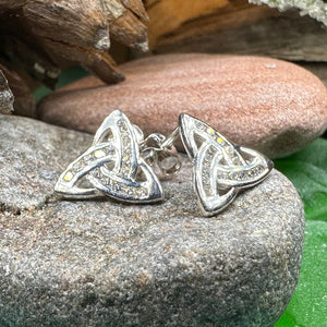 Beautiful highly polished trinity knot shaped earrings that feature solid sterling silver,and channel set with sparkling cubic zirconia diamond gemstone.