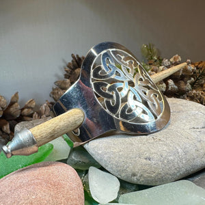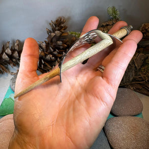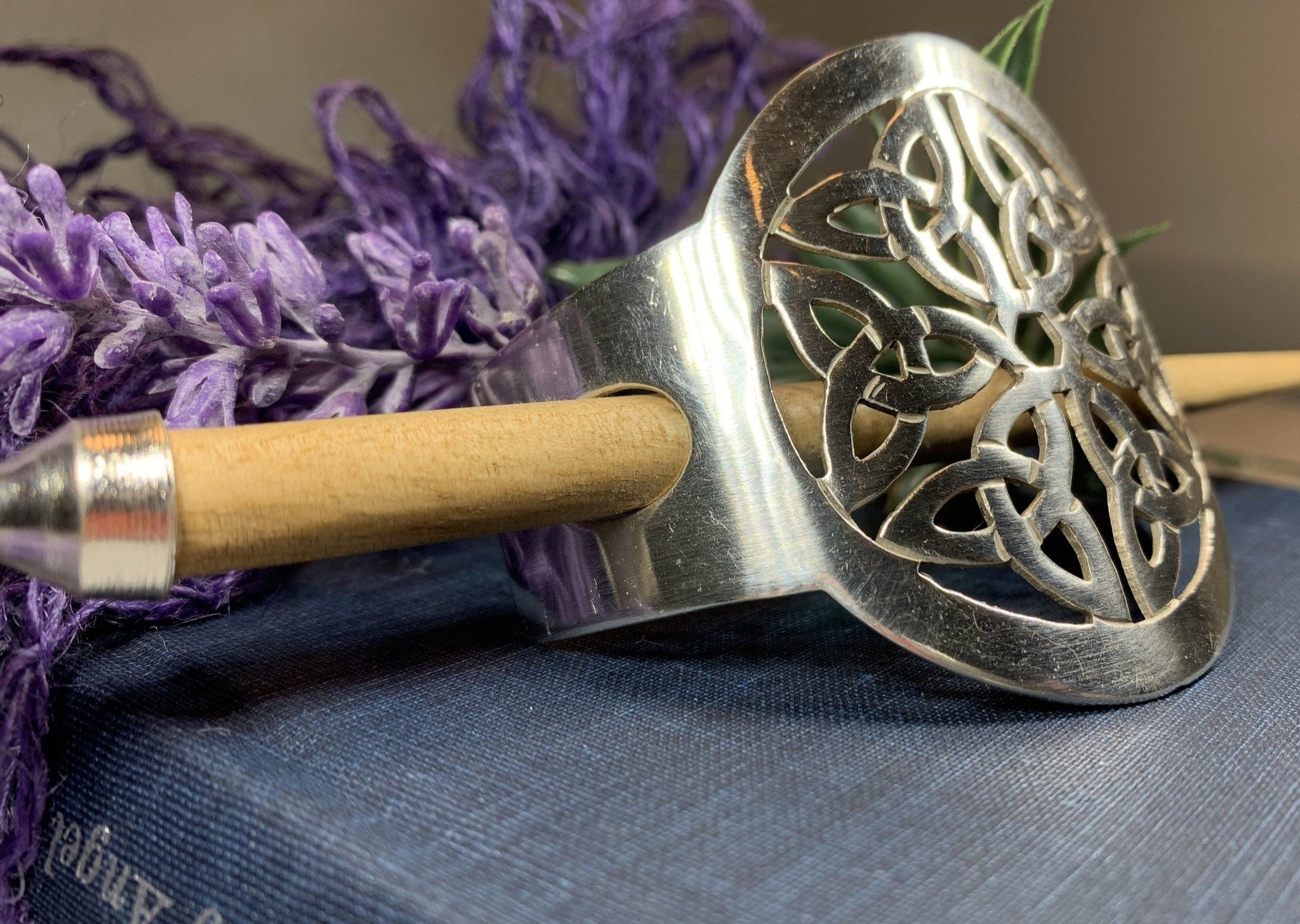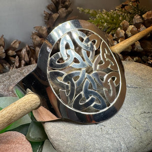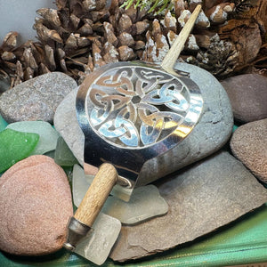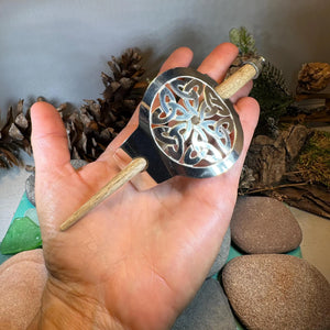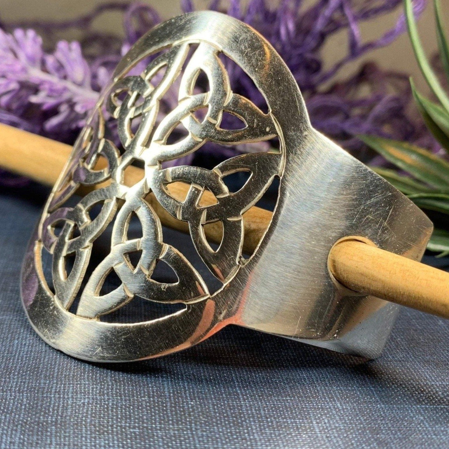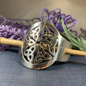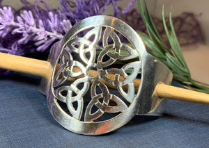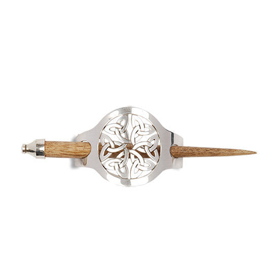 This unique hair slide uses the classic Trinity Knot to create an interesting design that will celebrate Celtic culture and catch everyone's eye. Made of polished pewter and rosewood stick.