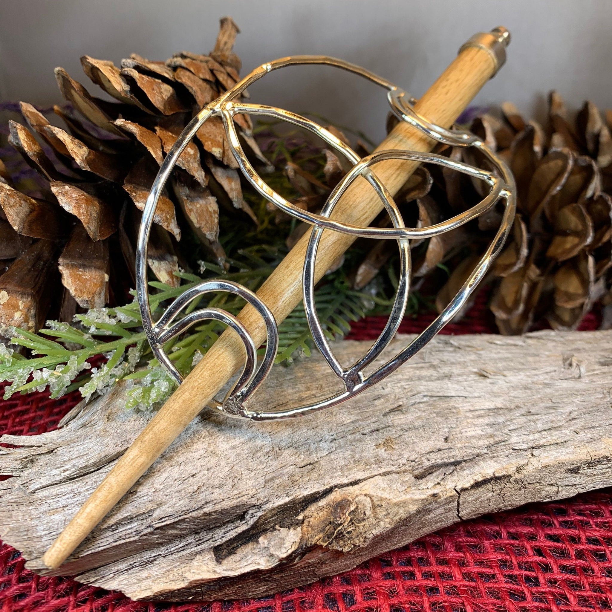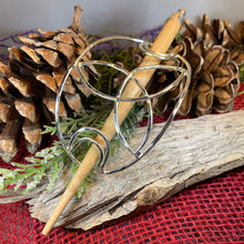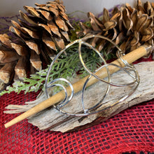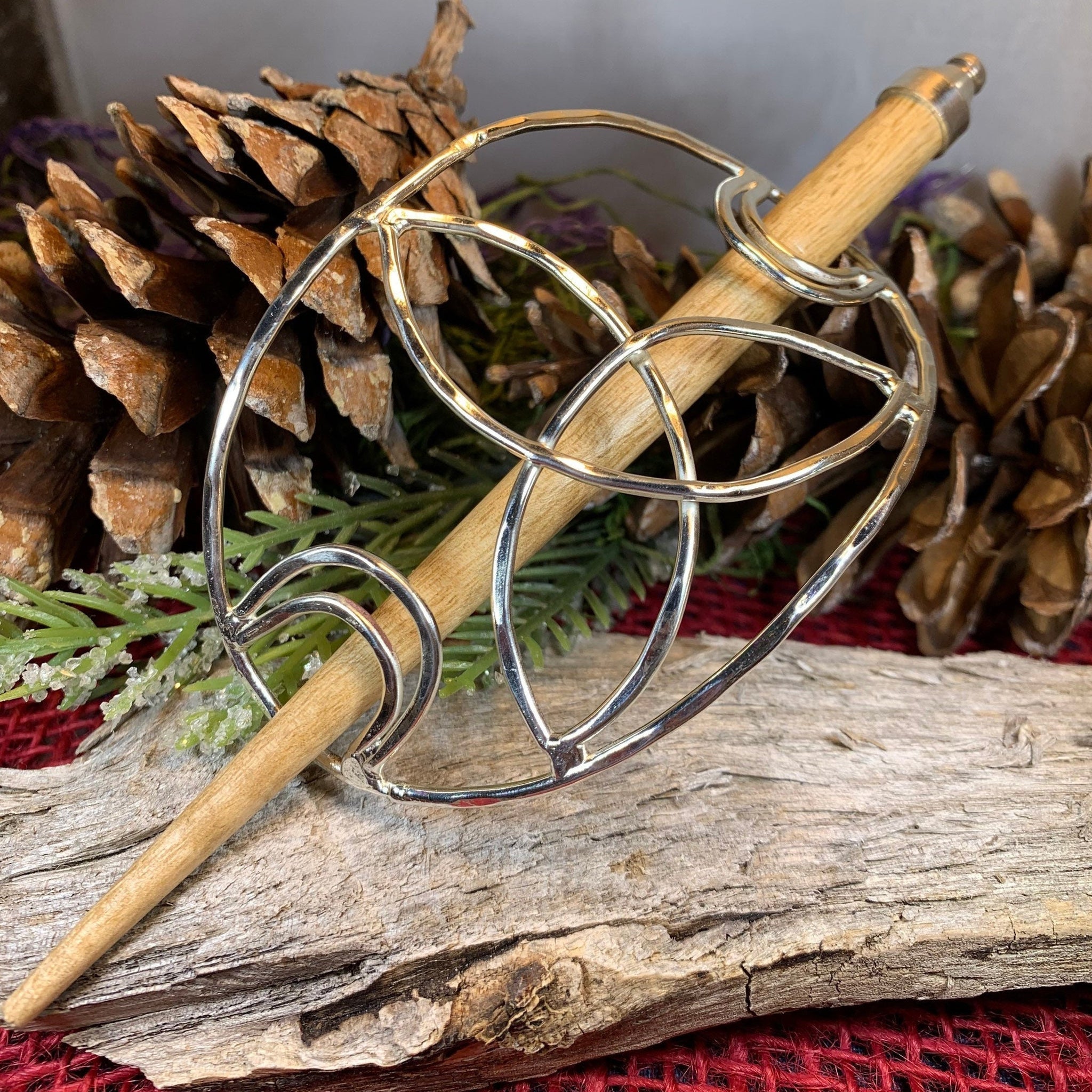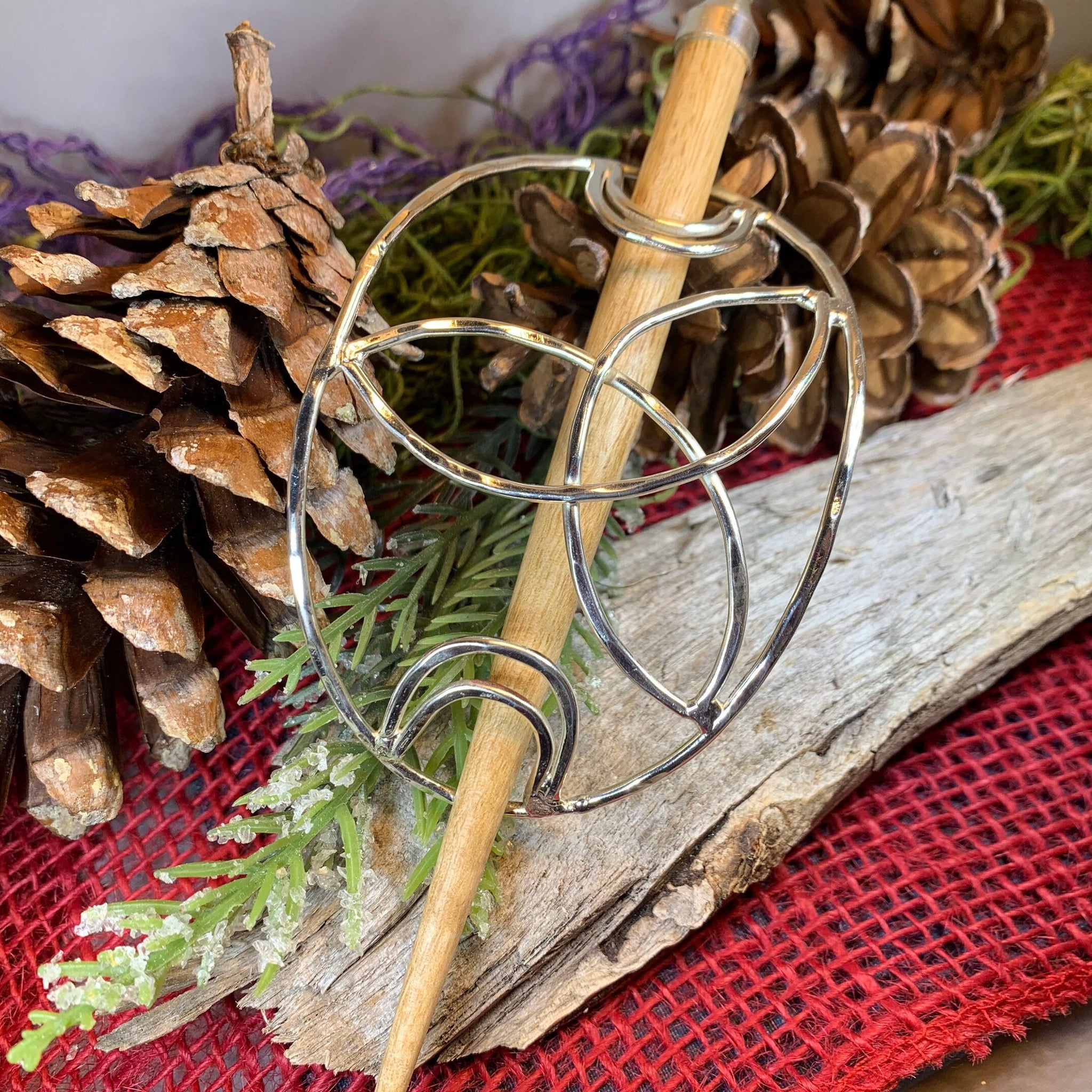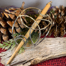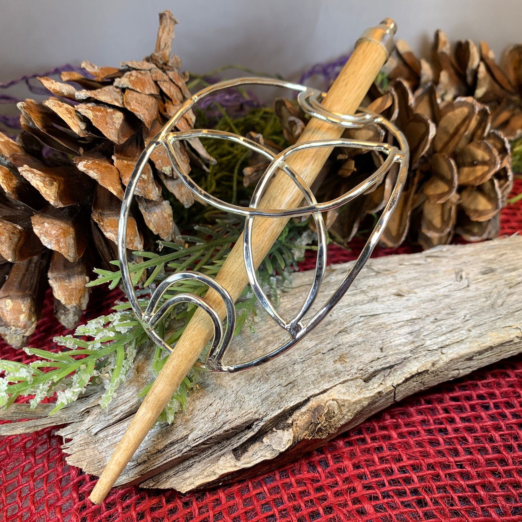 Main hair cage is 4 1/2" long x 2 1/2" wide (at the center). The oakwood stick is 5 1/2" long. Decorative focal piece measures 1 3/4" x 1 3/4" and is riveted to the leather piece (NOT glued) for durability.
