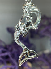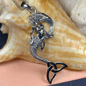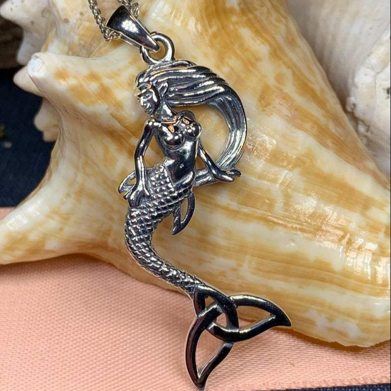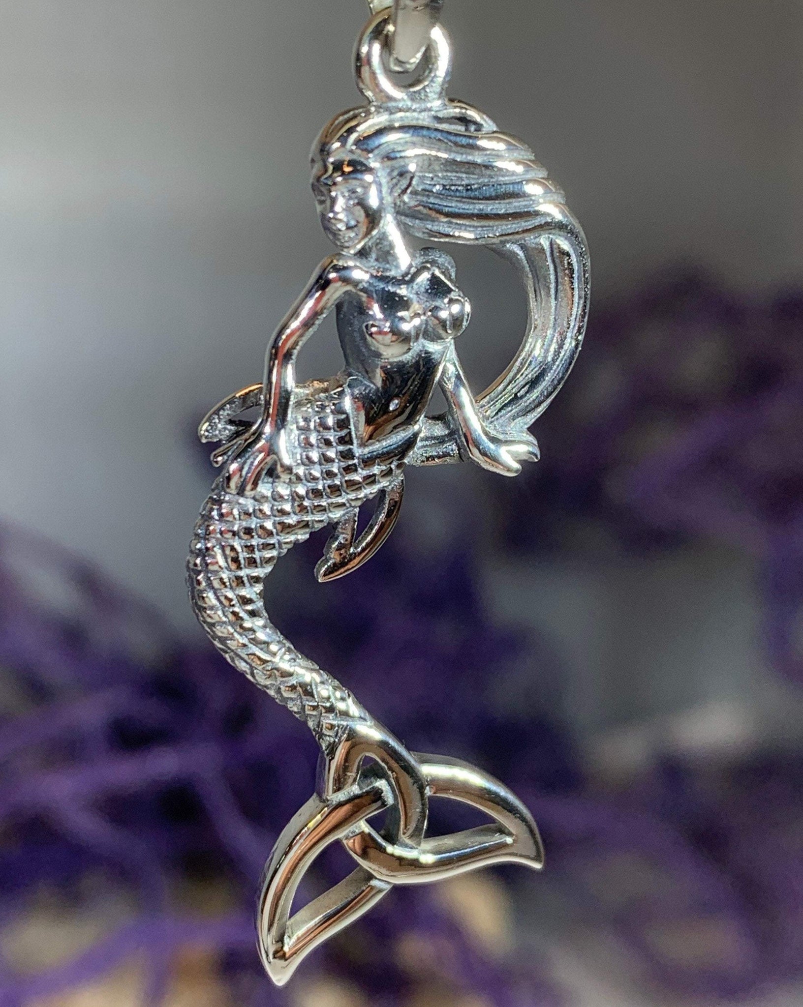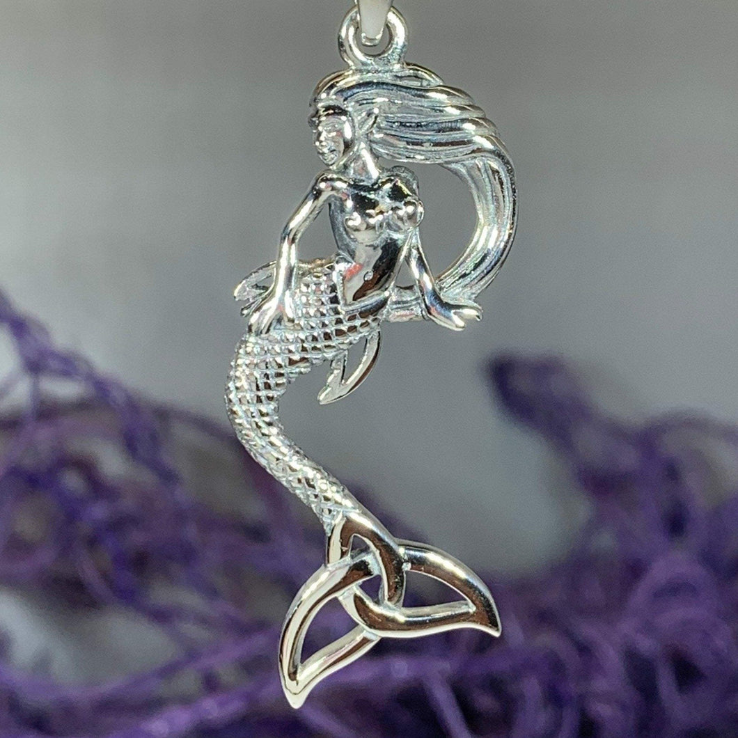Adorned with Celtic Trinity Knot details on her tail, this handcrafted sterling silver mermaid Pendant showcases exquisite craftsmanship and will make a memorable gift.