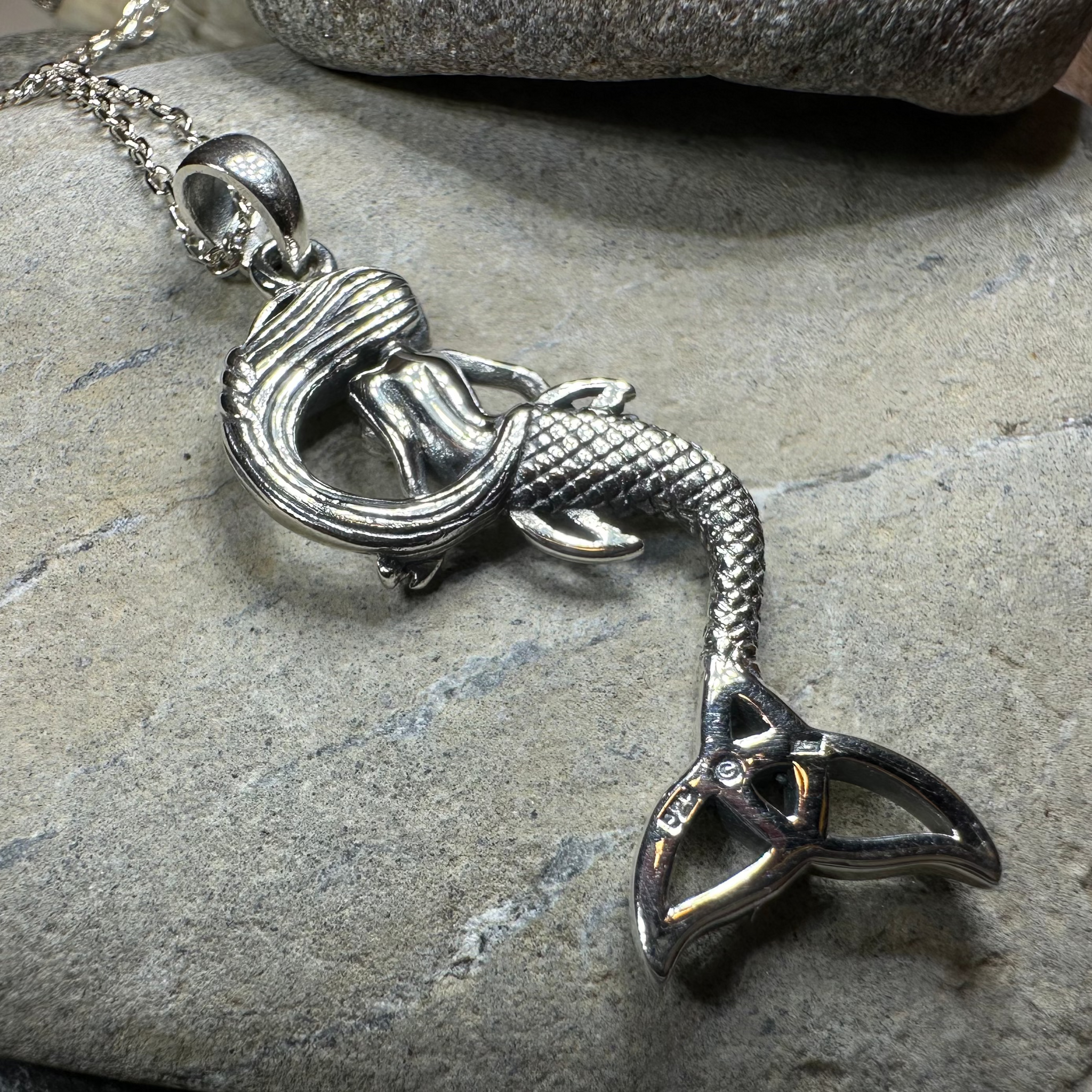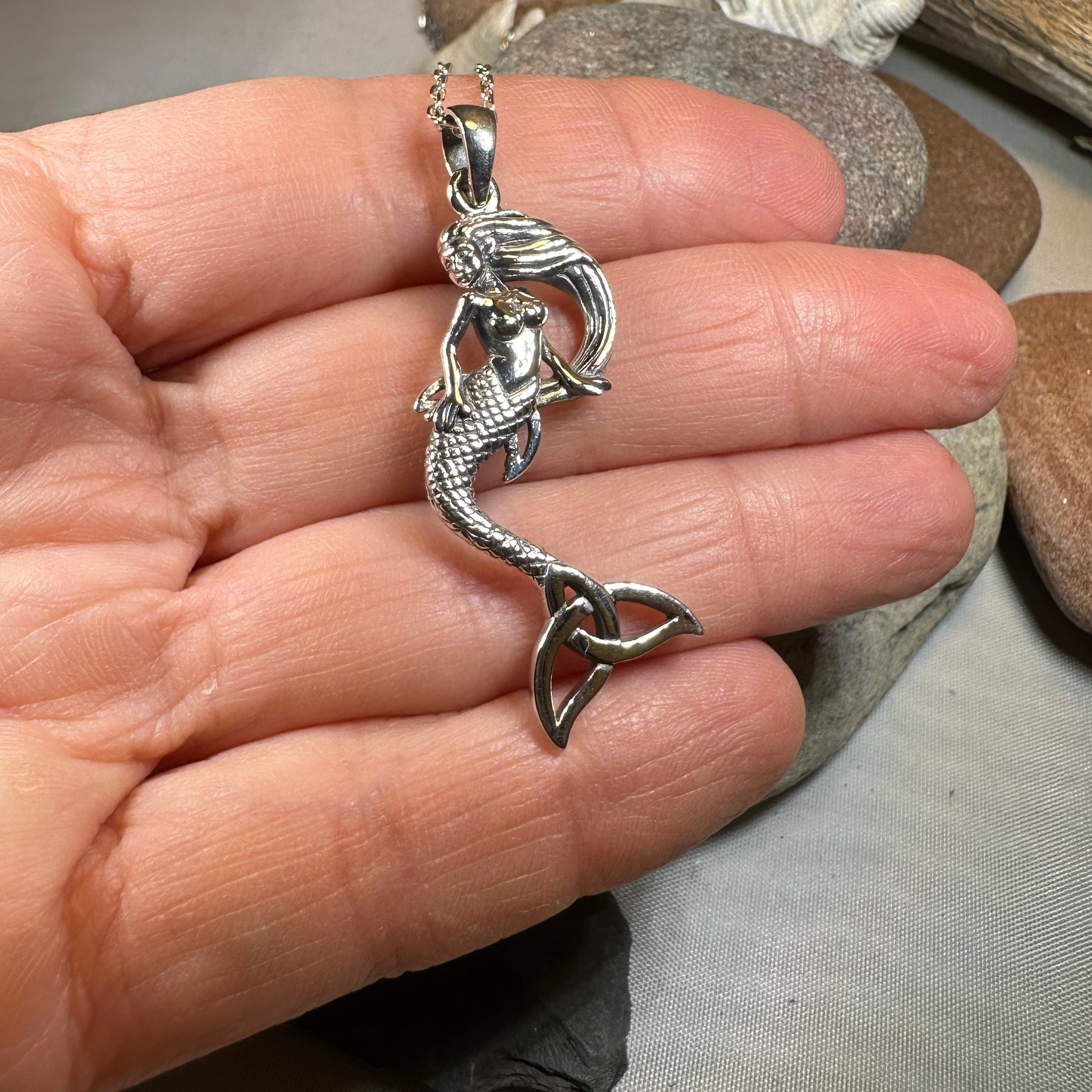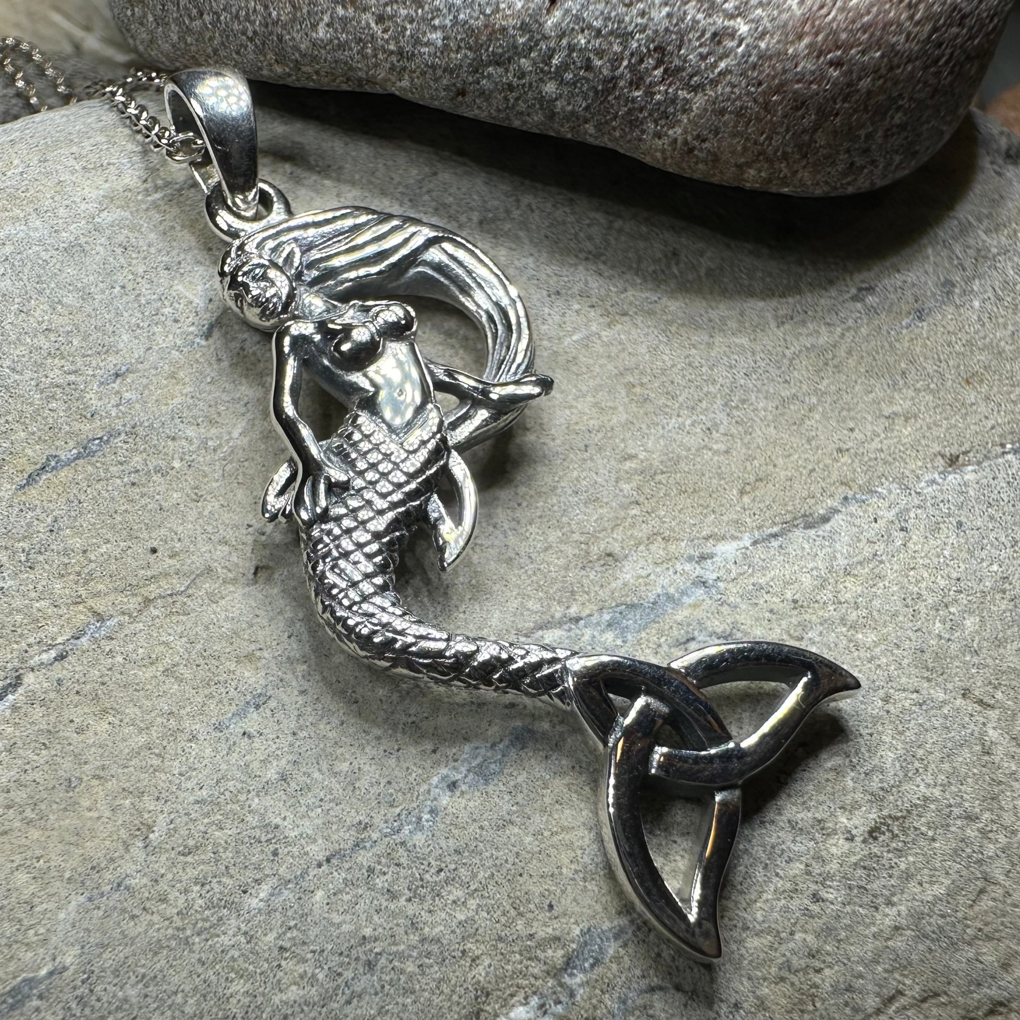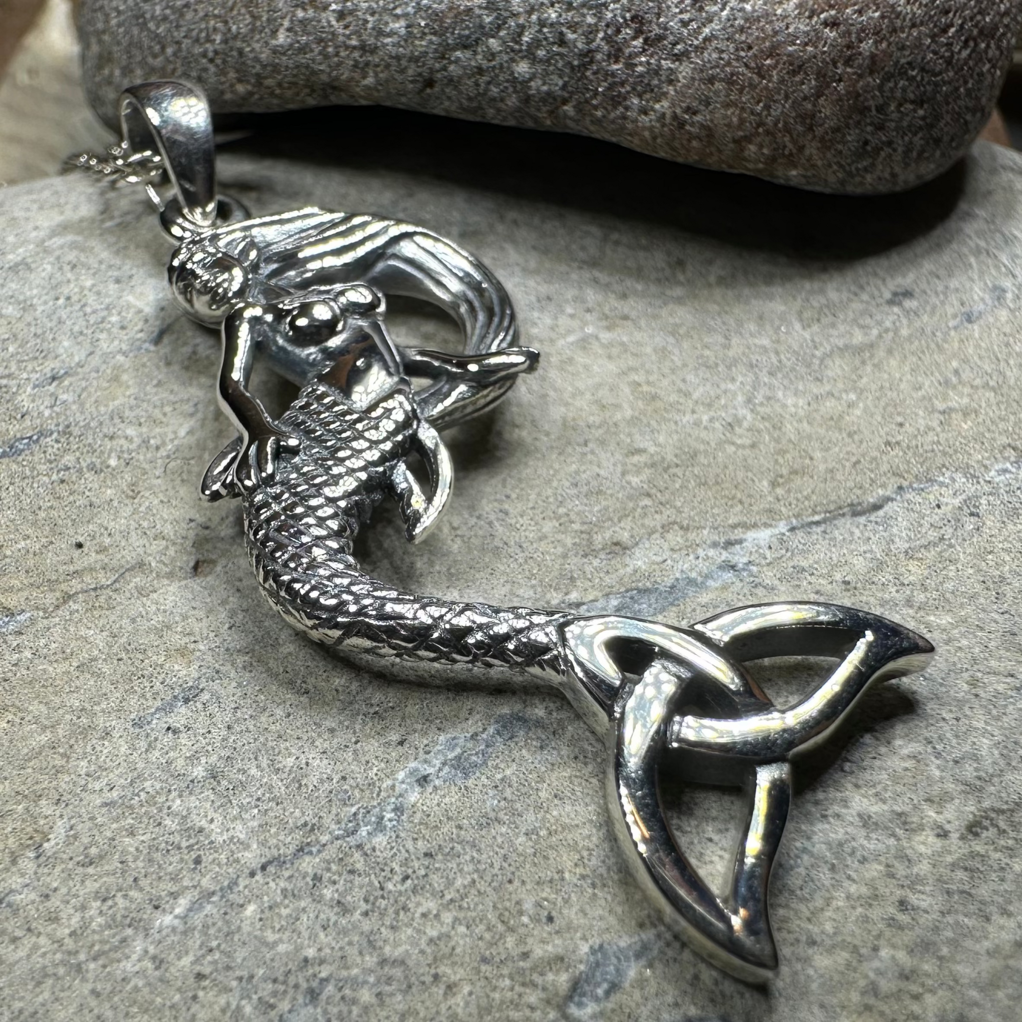 Adorned with Celtic Trinity Knot details on her tail, this handcrafted sterling silver mermaid Pendant showcases exquisite craftsmanship and will make a memorable gift.