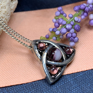 Attractive and detailed Trinity Knot necklace that feature a classic Celtic design. Adorned with three crystal stones and a colorful center stone in your choice of color, this pendant is unique and attractive!