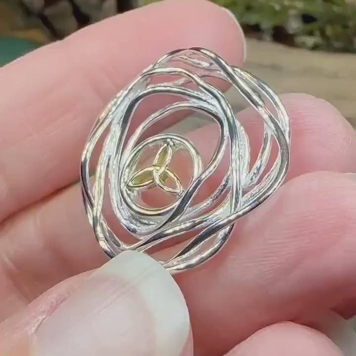 Delicate hoops of interlocking silver surround a traditional Celtic Trinity Knot, a design that goes back millennia to the iron age and beyond.