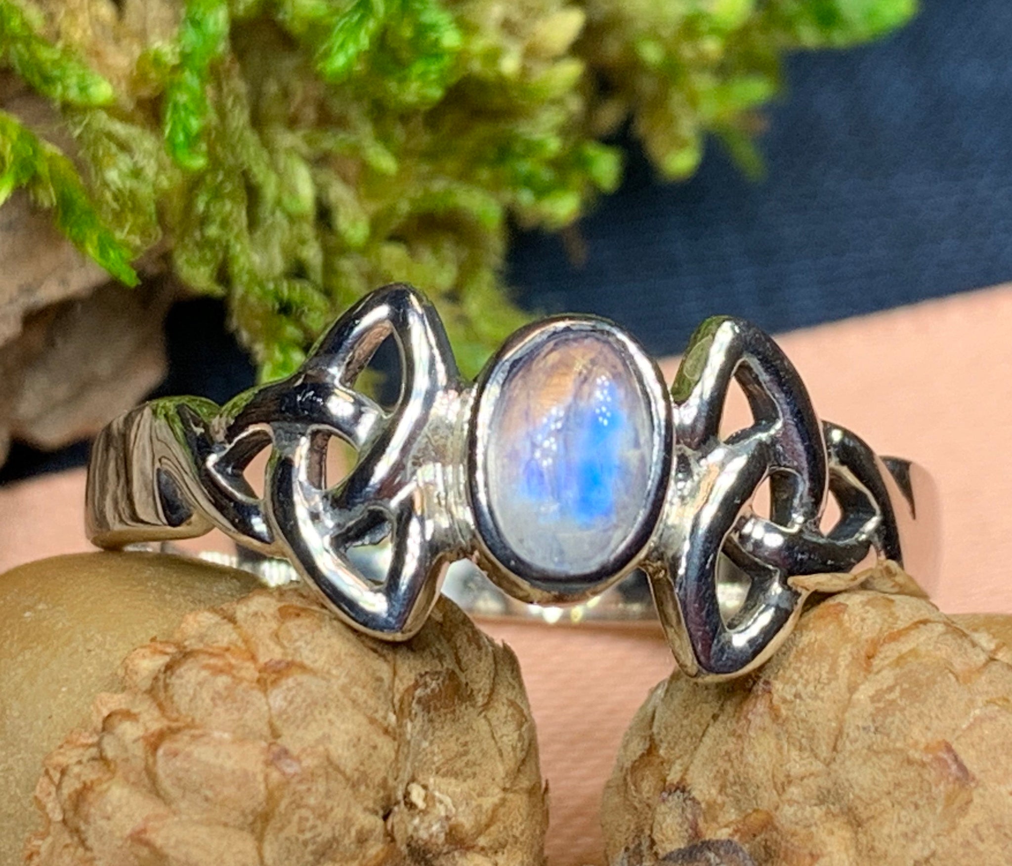 A unique design combining the traditional elements of the trinity knot with a modern twist - solid sterling silver with a beautiful cabochon natural rainbow moonstone that glows with a gorgeous blue glow.