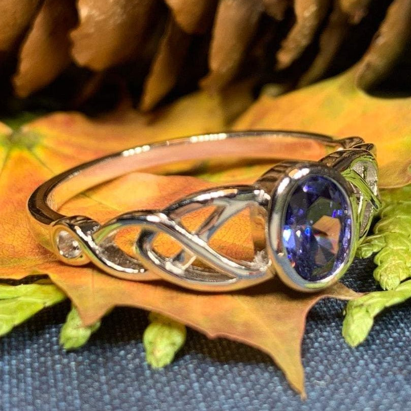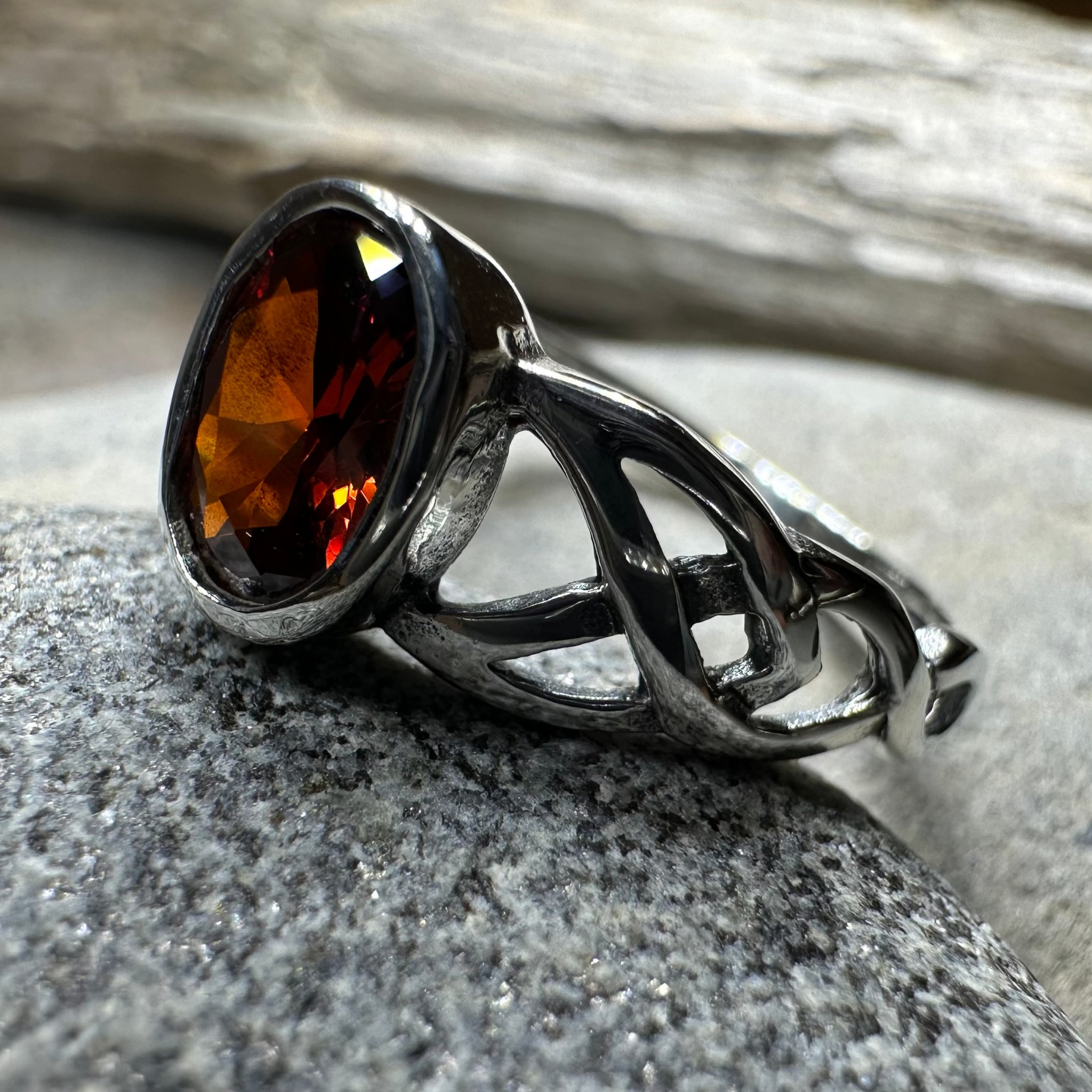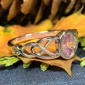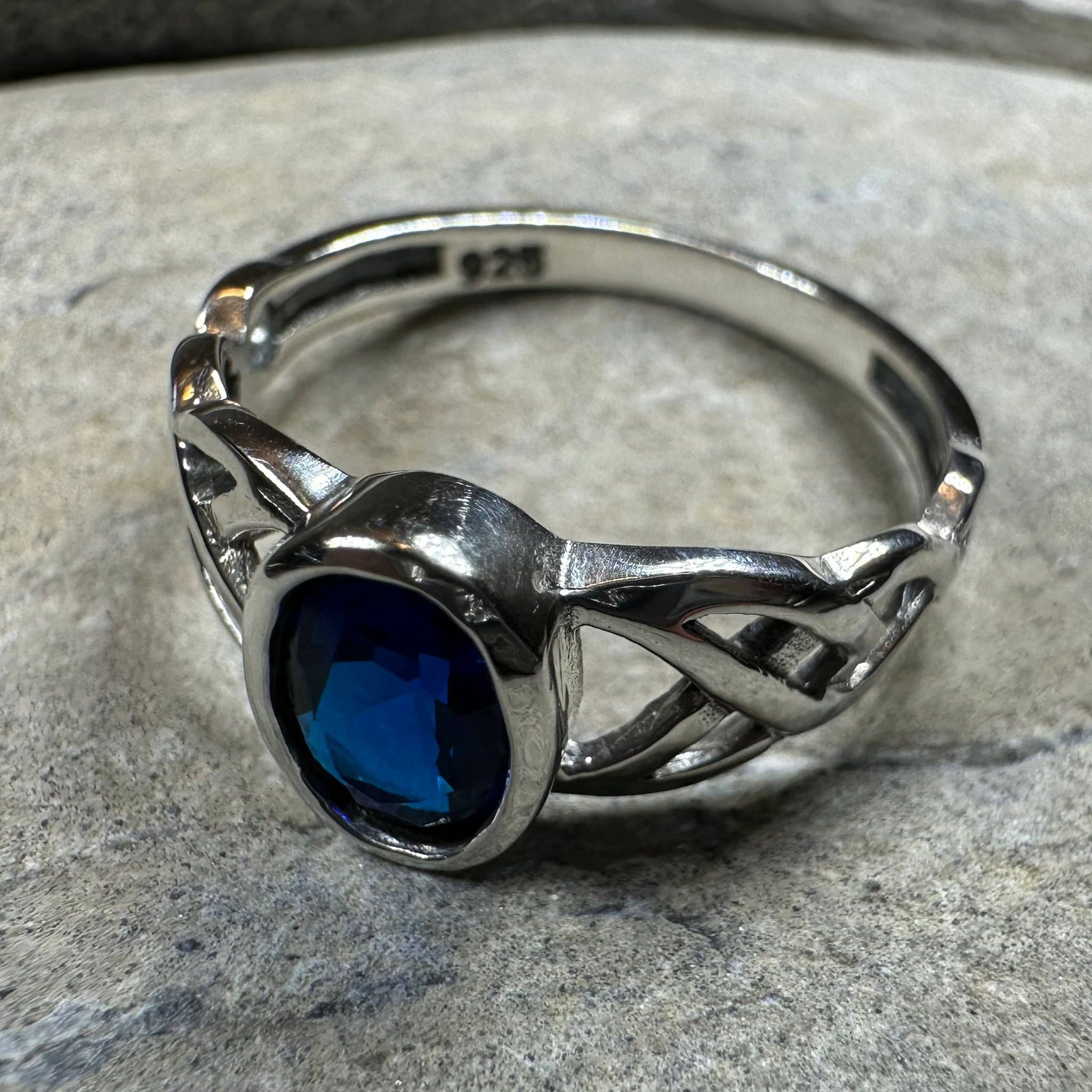 Solid Sterling Silver - A unique design combining the traditional elements of the trinity knot with a modern twist - solid sterling silver with a beautiful oval faceted cubic zirconia gemstone in your choice of color.