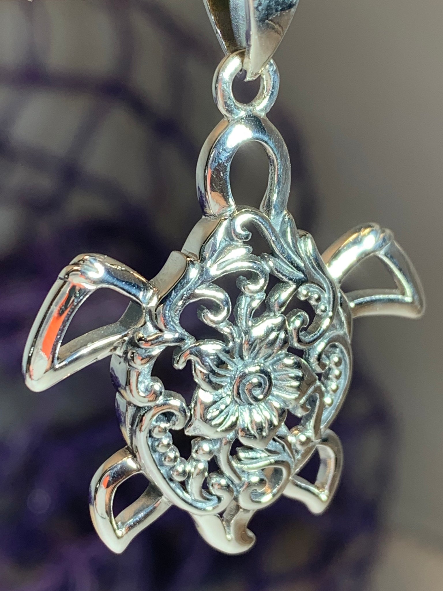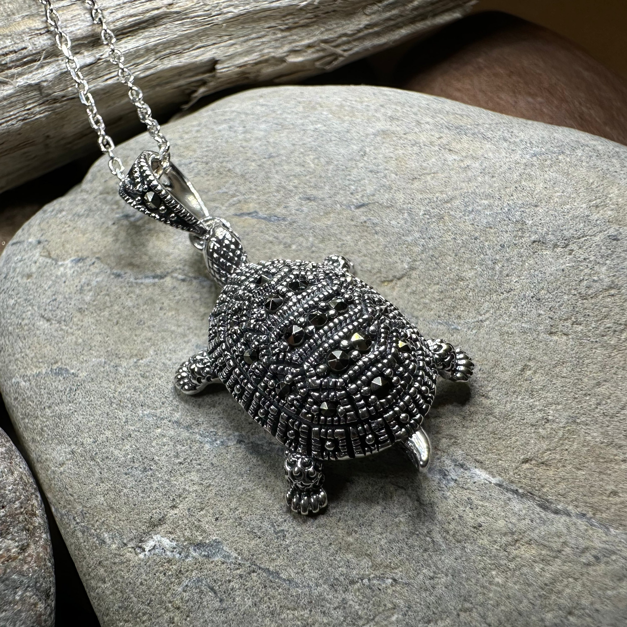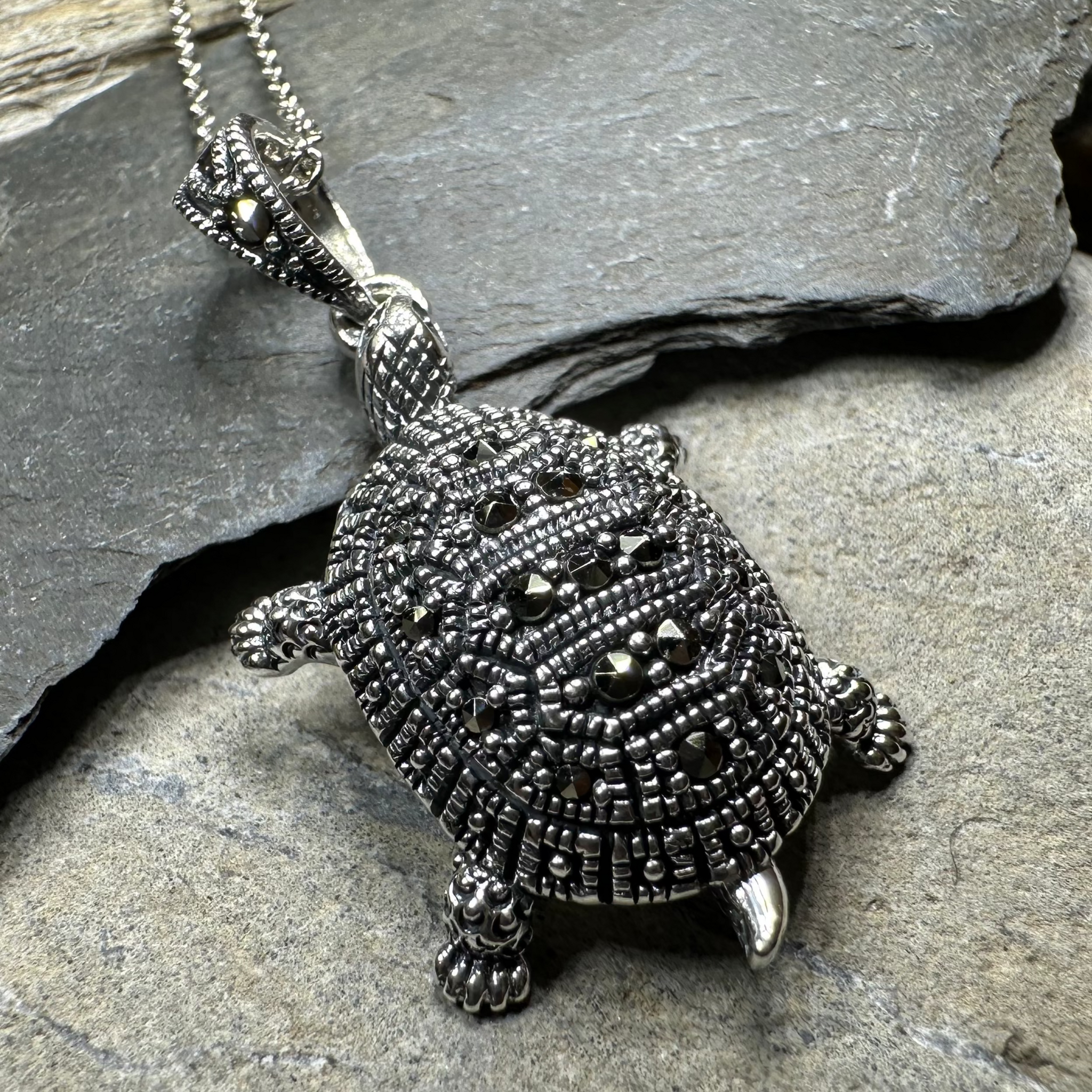 A lovely handmade 1" x 3/4" sterling silver turtle with beautiful marcasite gemstones on an 18" sterling silver chain.