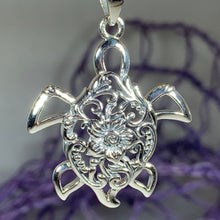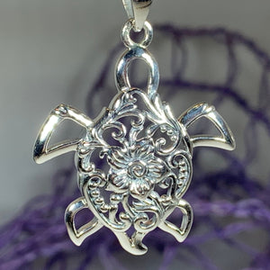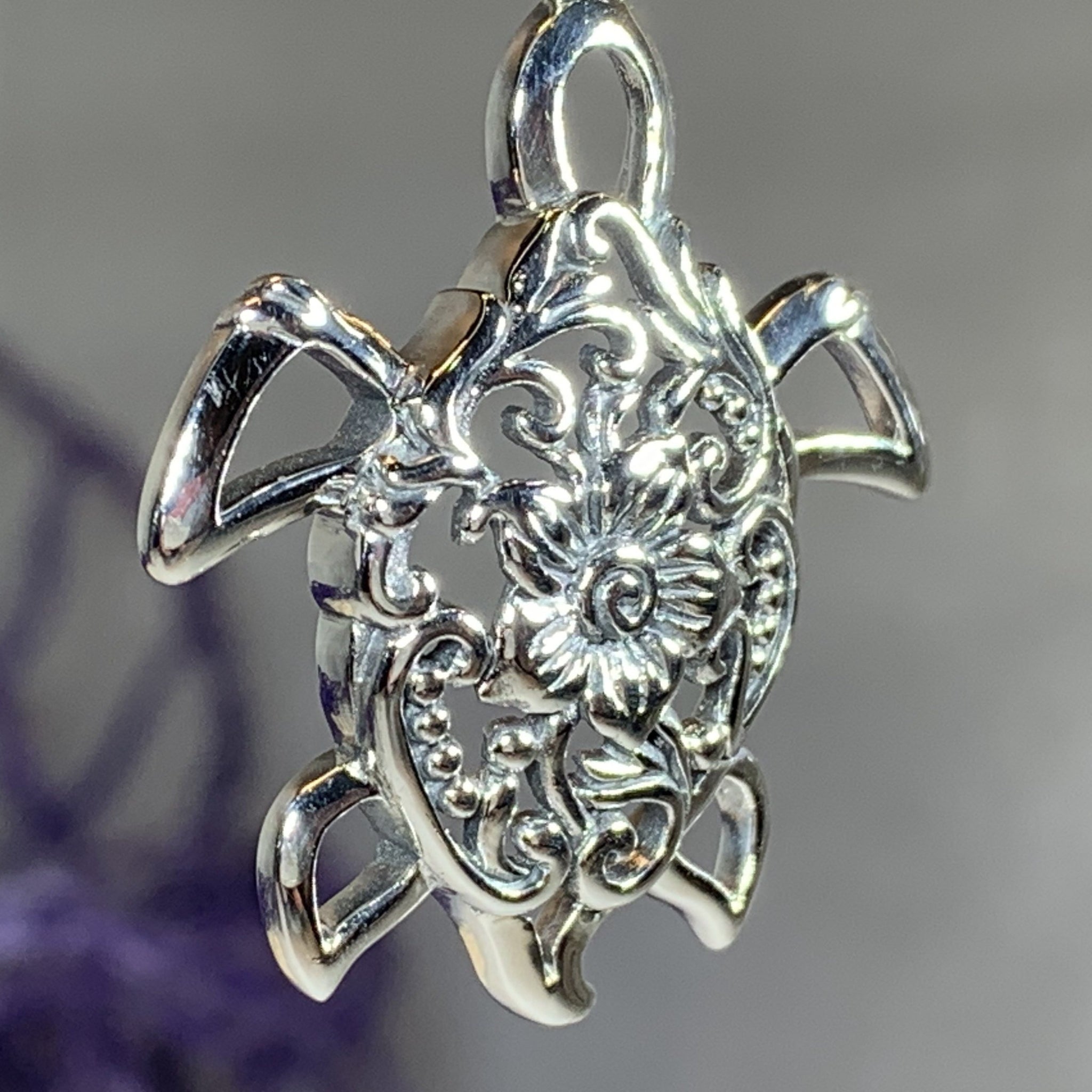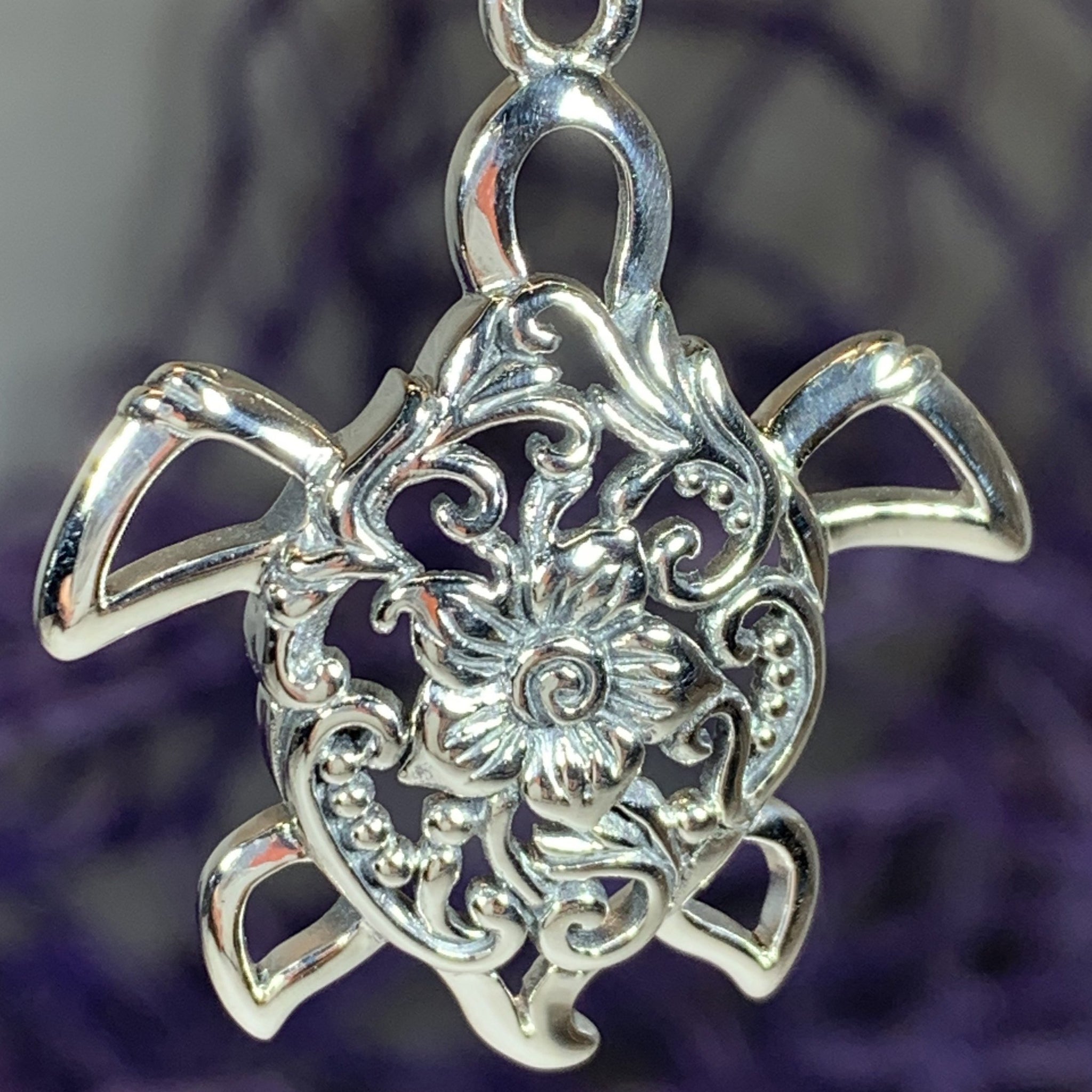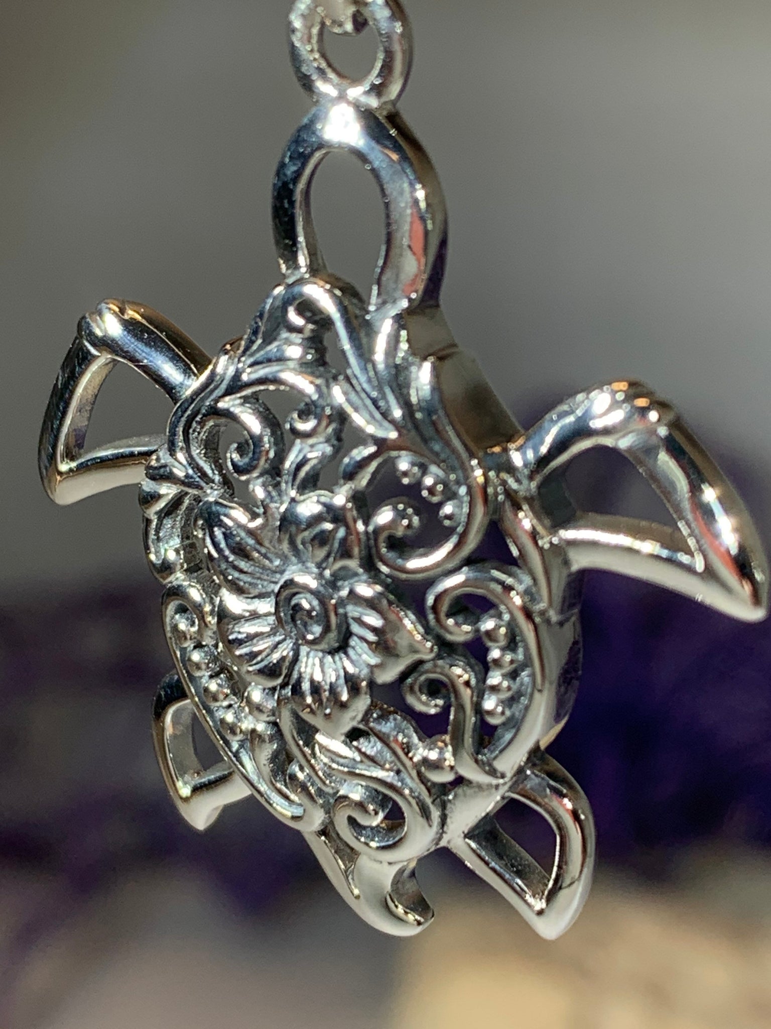 A lovely handmade 1" x 3/4" sterling silver turtle with beautiful marcasite gemstones on an 18" sterling silver chain.