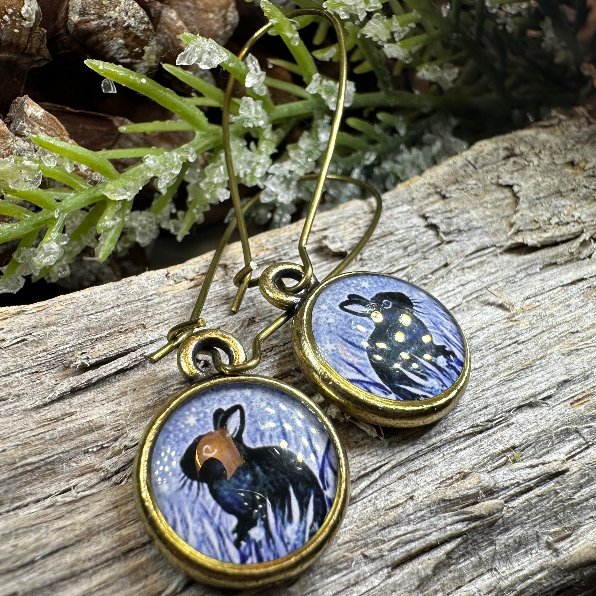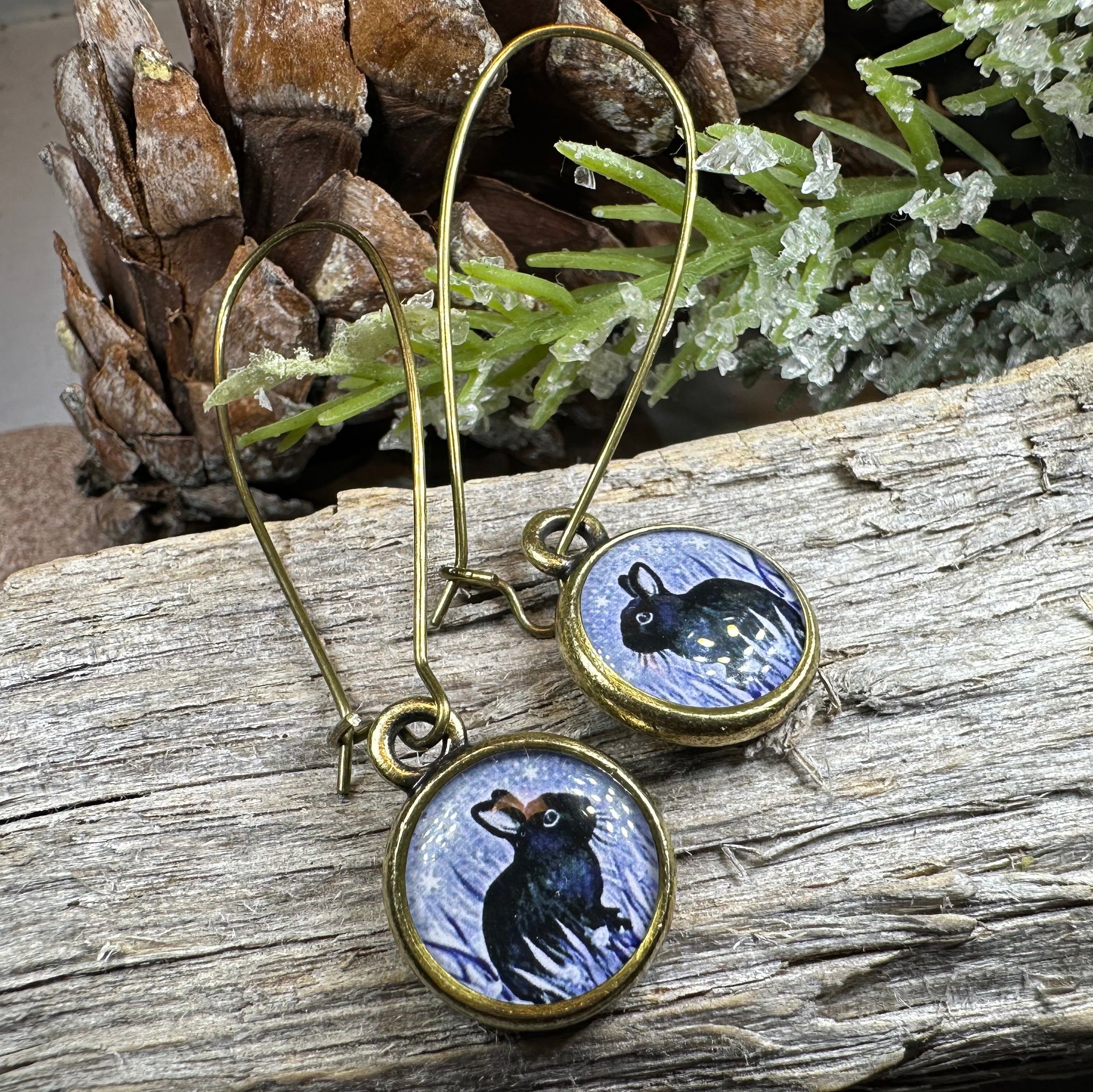 Unique handmade artisan earrings that feature original artwork by an American artist. These earrings are unique and beautiful - the intricate artwork print features a black rabbit with purple grasses in a forest.