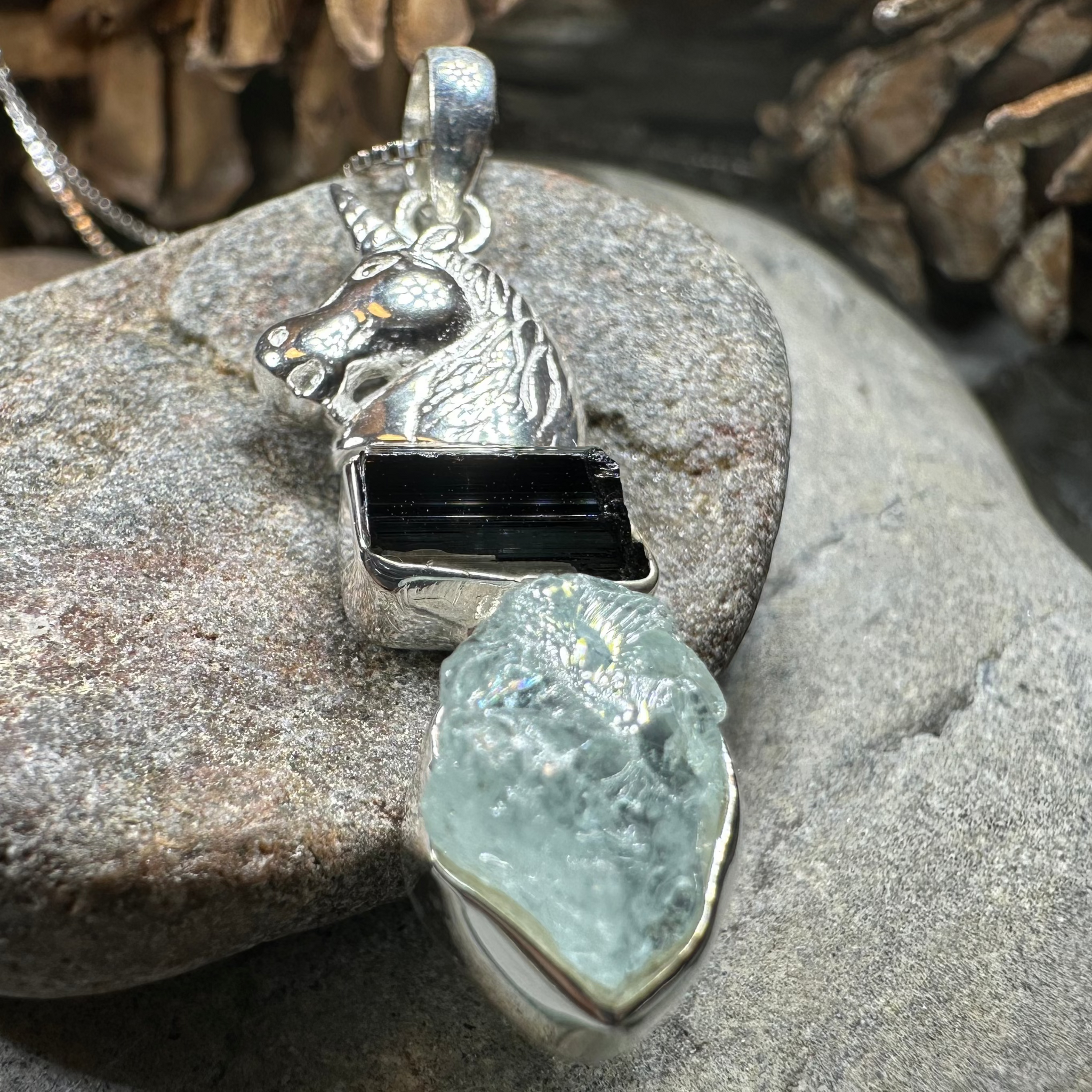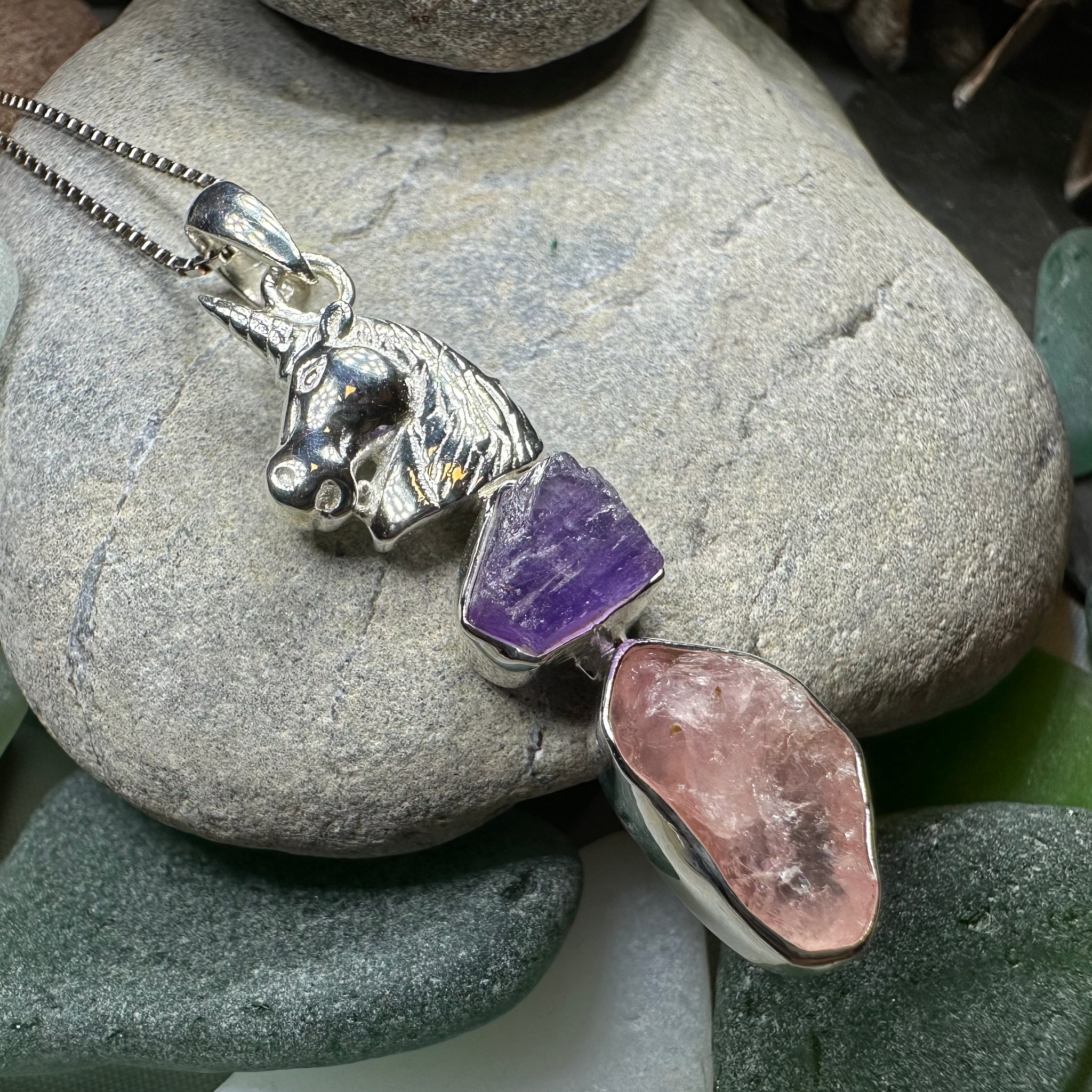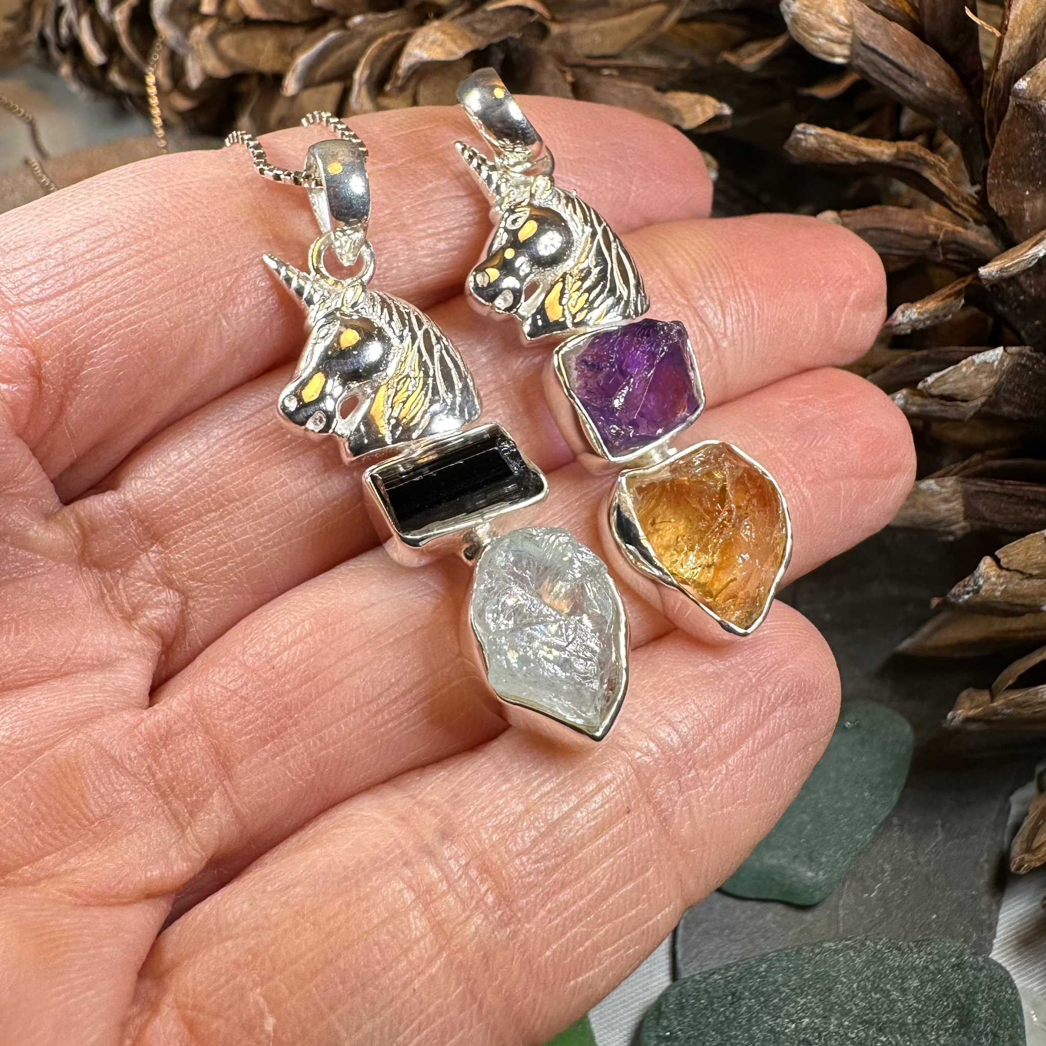 A lovely little unicorn in solid sterling silver standing an an authentic raw gemstone. The natural state of the gemstone creates a beautiful piece - the stone glows and is a great unique way to enjoy a beautiful, authentic gemstone.