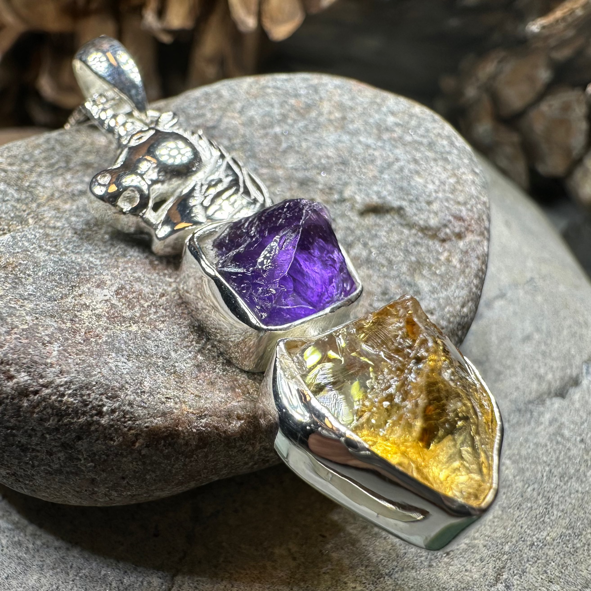 Solid sterling silver 1 1/2" x 1/2" pendant with authentic raw gemstones.