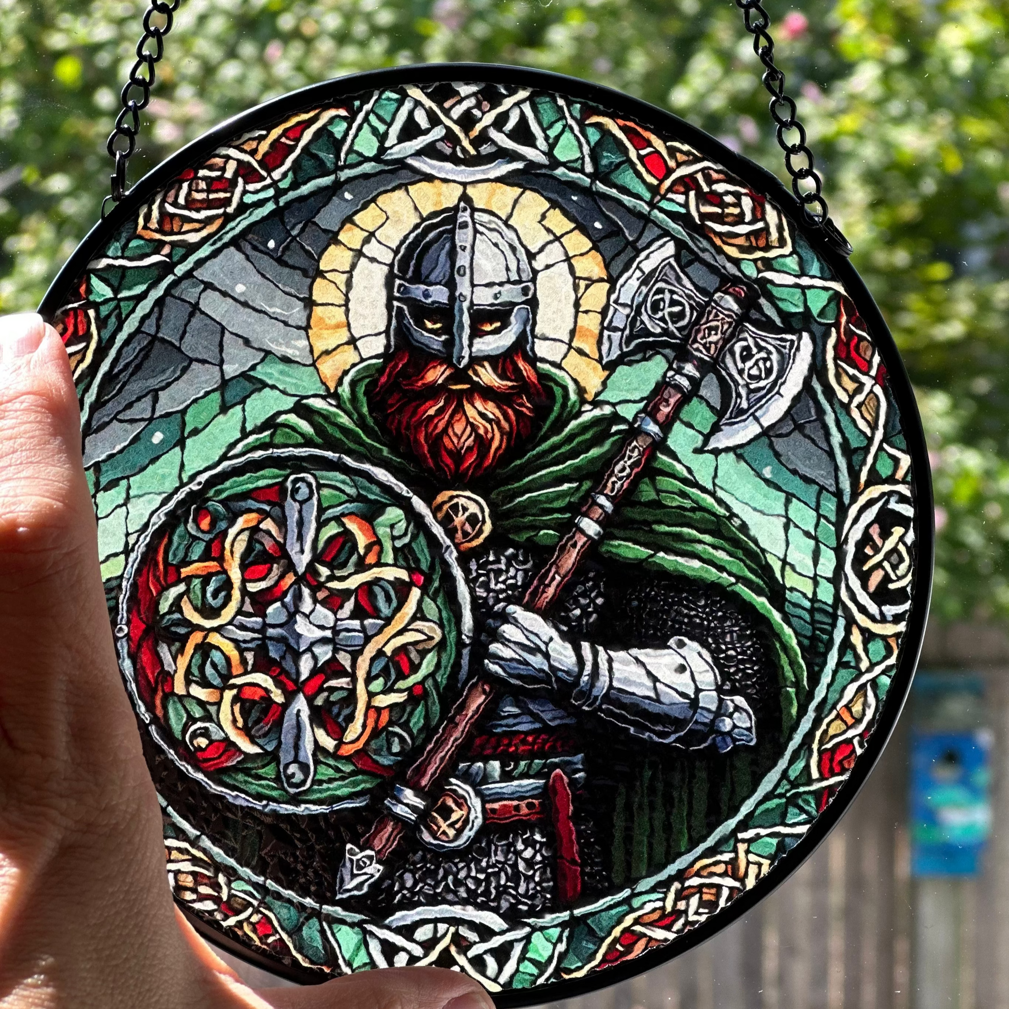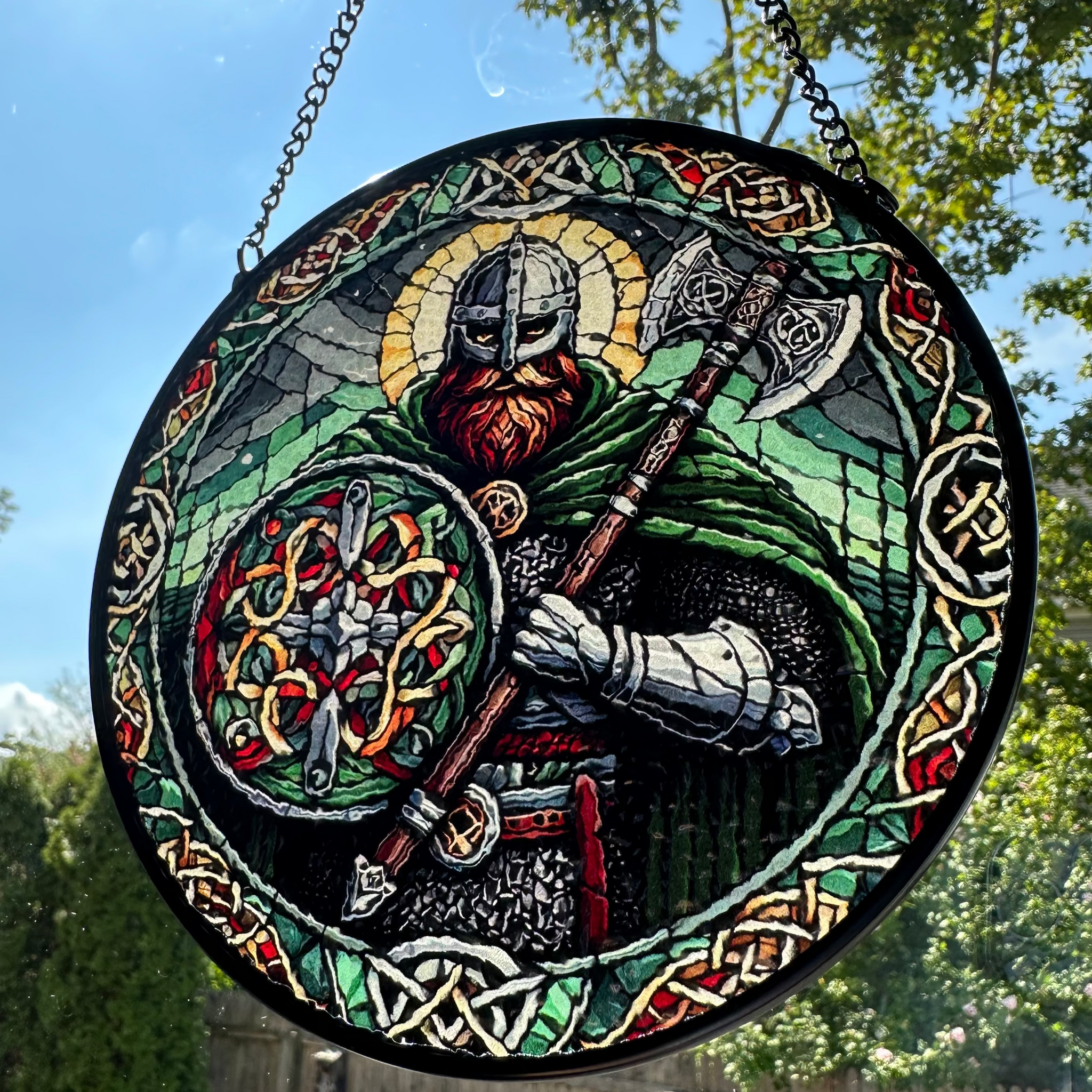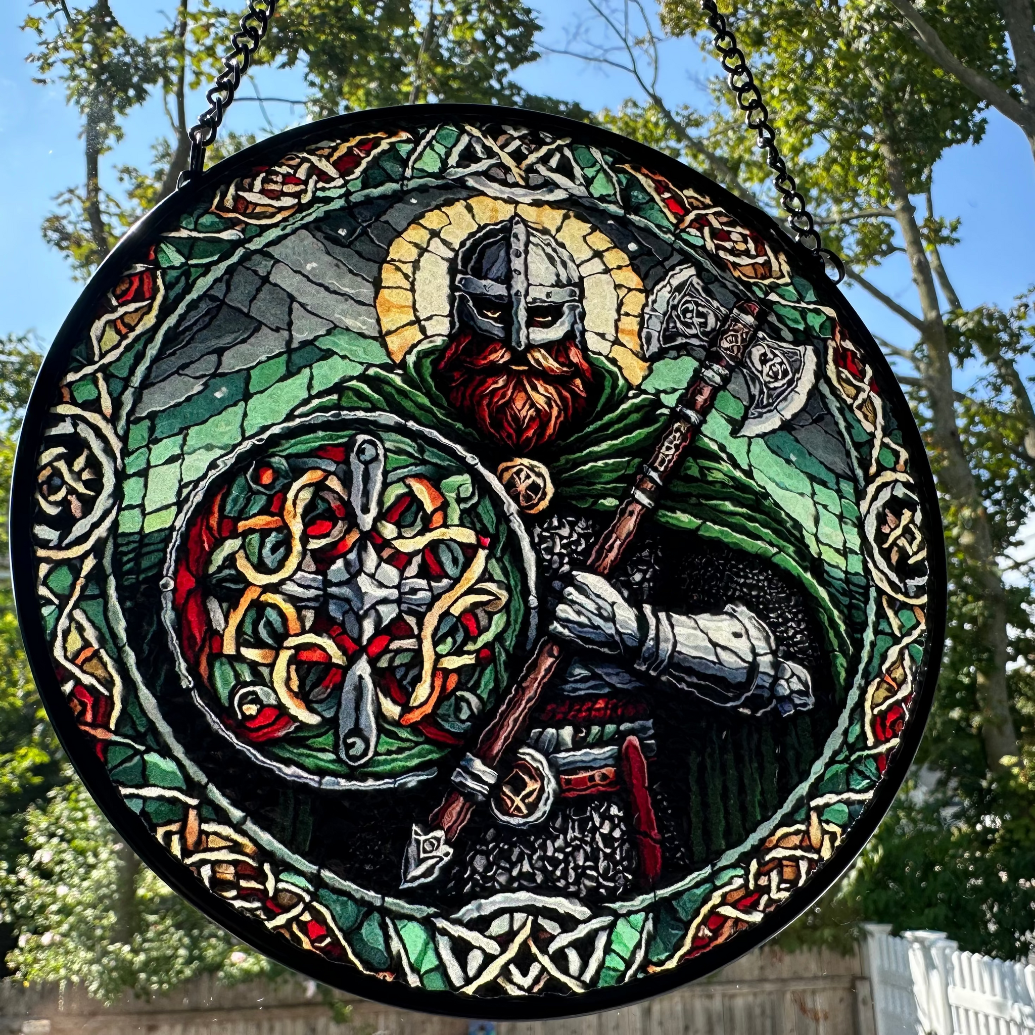 This Viking Warrior window art glows in beautiful colors. With vibrant colors and - a perfect and colorful scene that will bring you joy every time you see it!