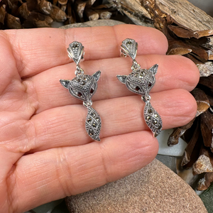 Elegant fox face with dangling tail drop earrings in Solid Sterling Silver with authentic marcasite gemstones and garnet eyes - you can see every detail from the tiny ears to the upturned snout and its flowing tail