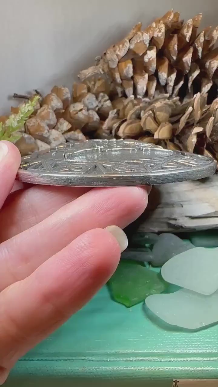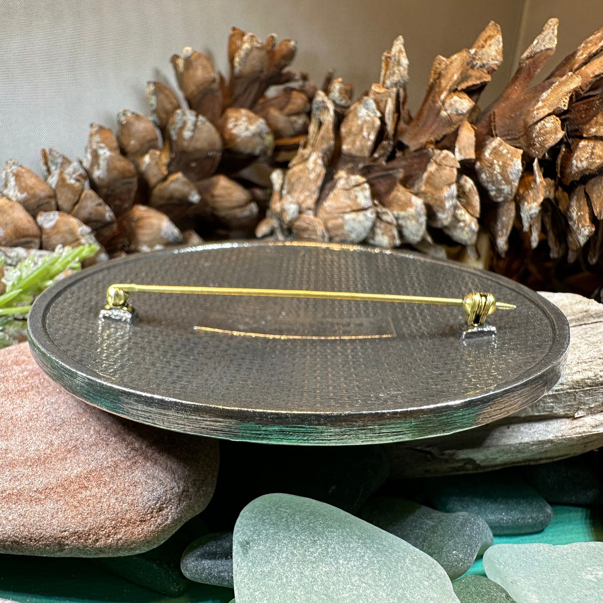 Solid Pewter with antiqued finish and a locking pin.