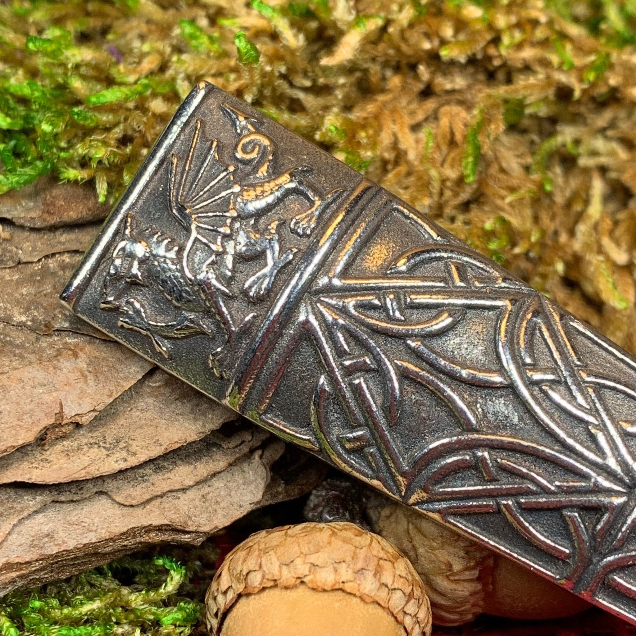 A truly beautiful kilt pin with an antiqued finish. This lead free pewter pin features an elaborate Welsh dragon with majestic wings reaching upwards, all in antiqued finish.
