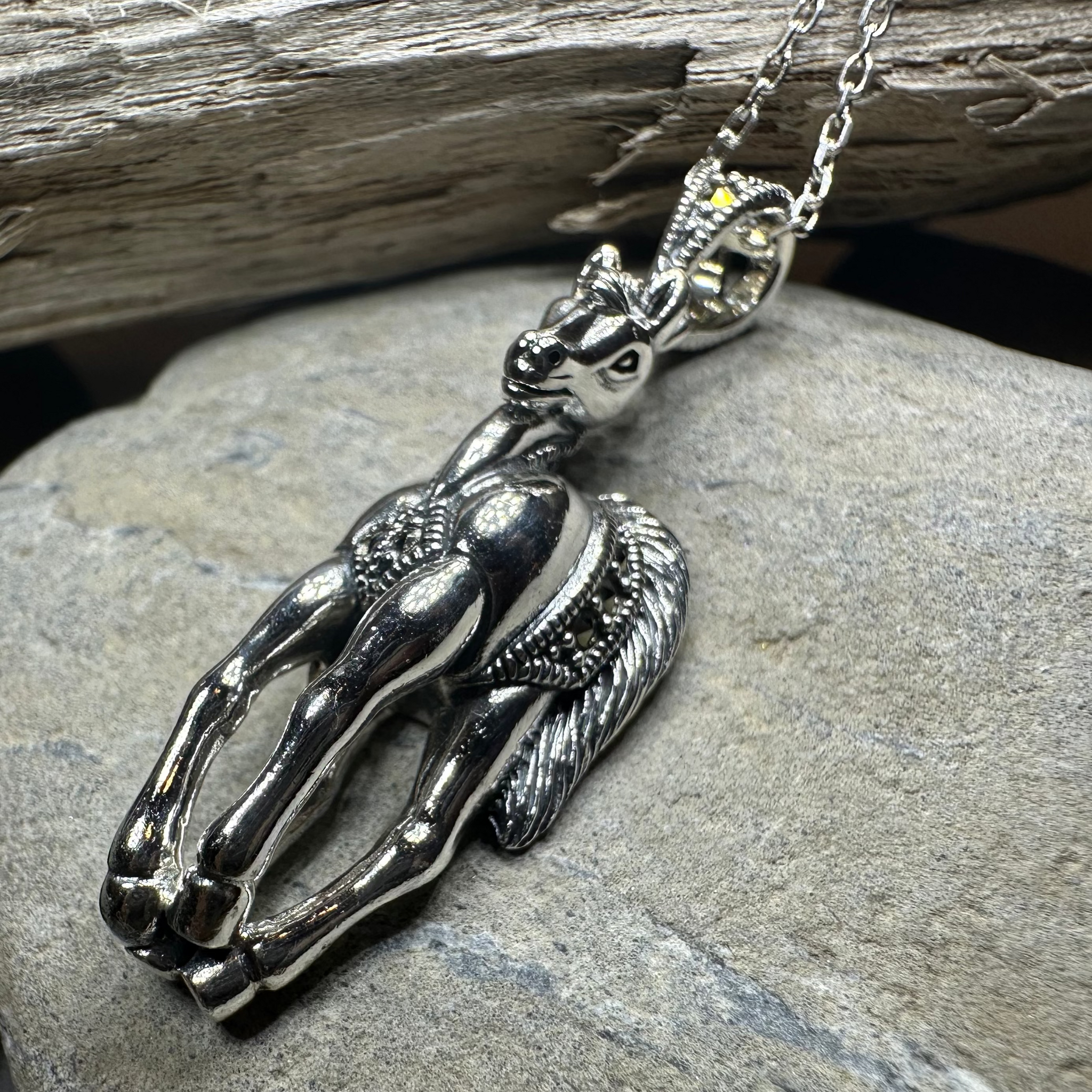 Elevate your style with the Wildfire Marcasite Horse Necklace, a stunning piece crafted from highly polished sterling silver.