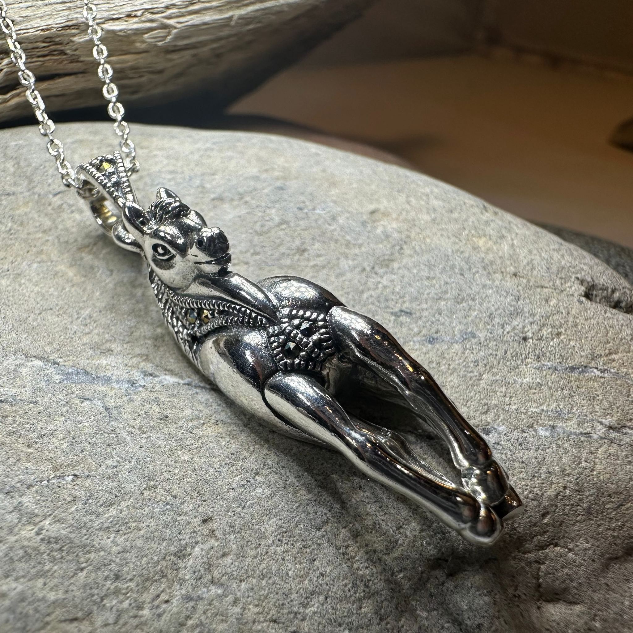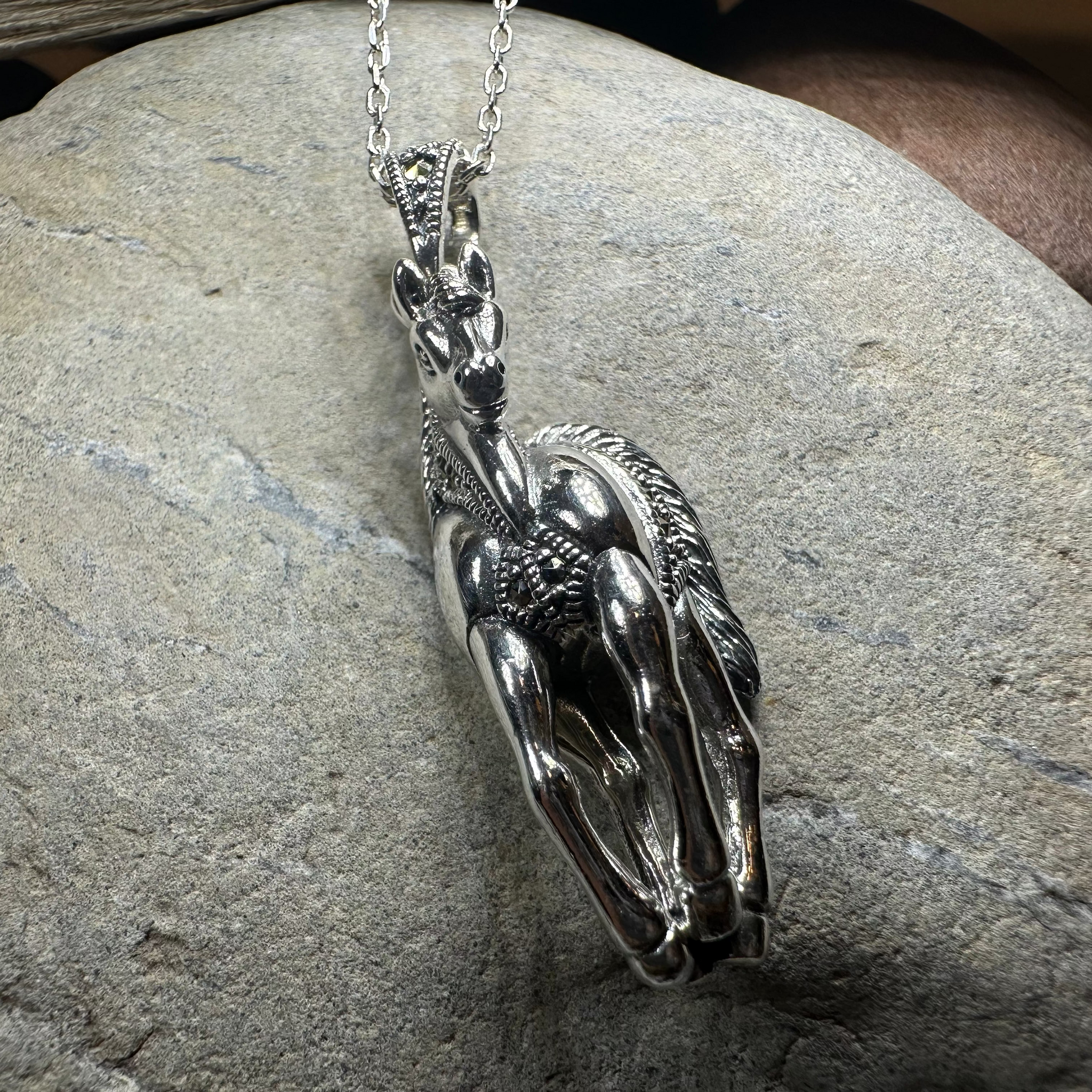 This exquisite necklace captures the grace and strength of the horse, enhanced by the subtle sparkle of marcasite accents that add a refined touch. Perfect for those who appreciate equestrian beauty and timeless elegance, it offers a sophisticated accessory that complements both casual and formal attire.
