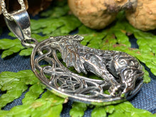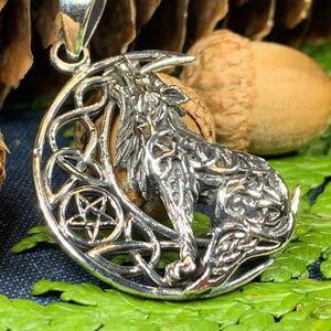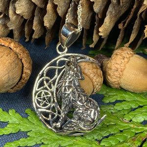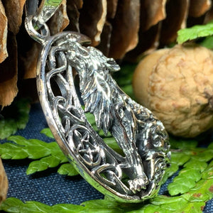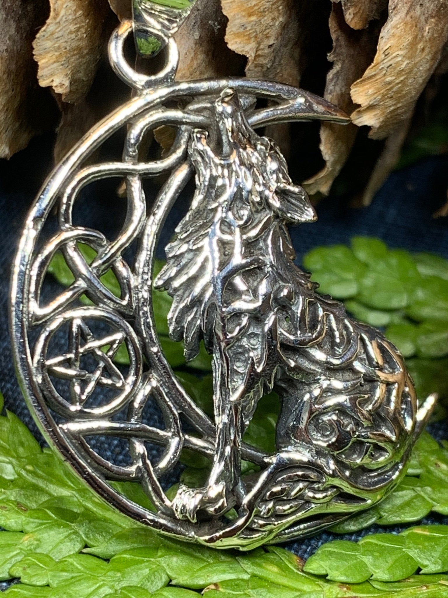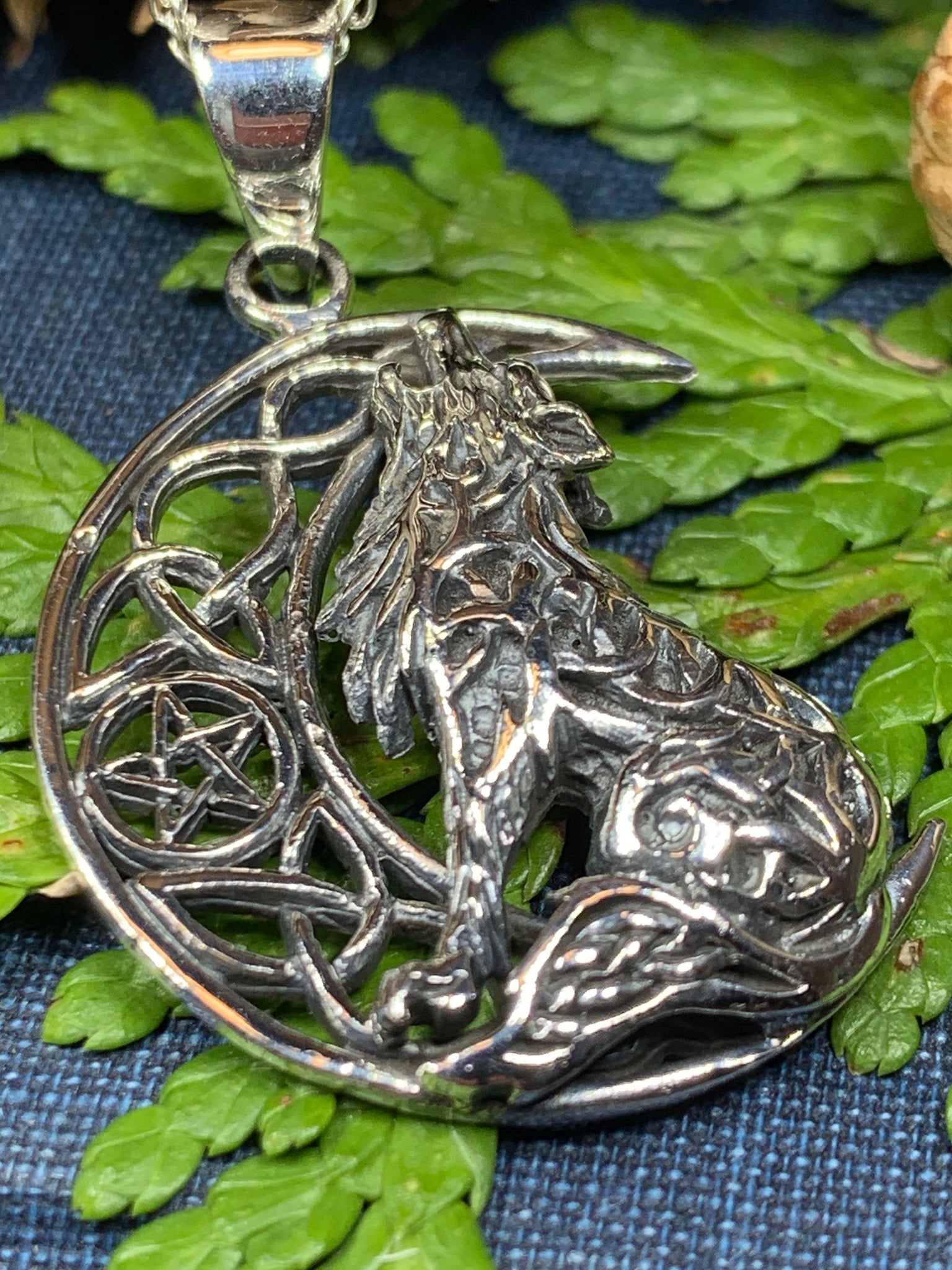 This detailed Celtic Wolf Moon will catch the eye. A beautiful design with intricate knot work on a crescent moon with a wolf howling proudly within a Celtic moon. Solid sterling silver on an 18" silver chain.